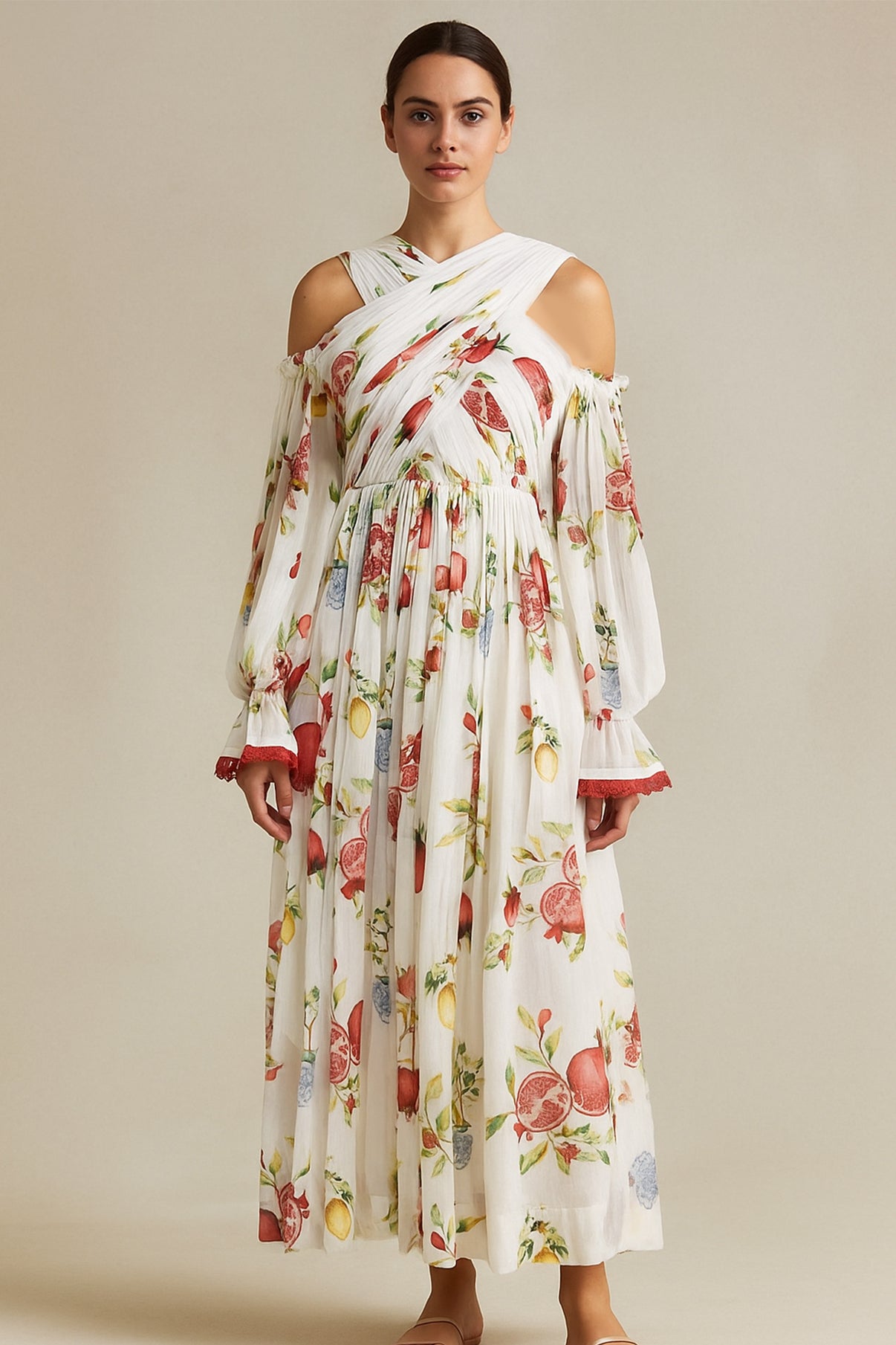 The Off White printed Maxi dress with cold shoulder stylised sleeves, has a halter neck style from front. The Sleeves hem and outfit hem has off white and red intricate lace detailings giving a perfect summer vibe, a must for your brunch outings.