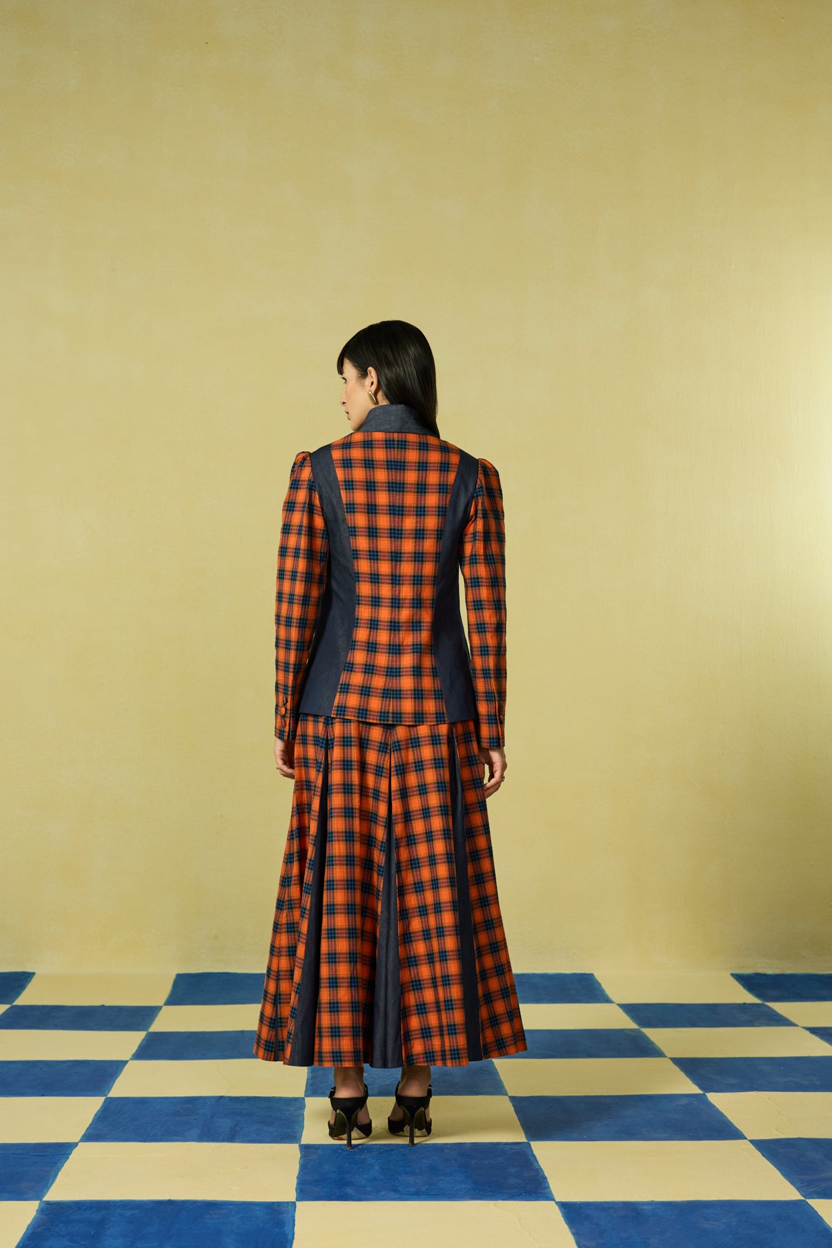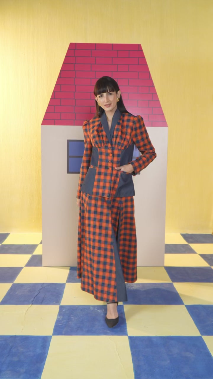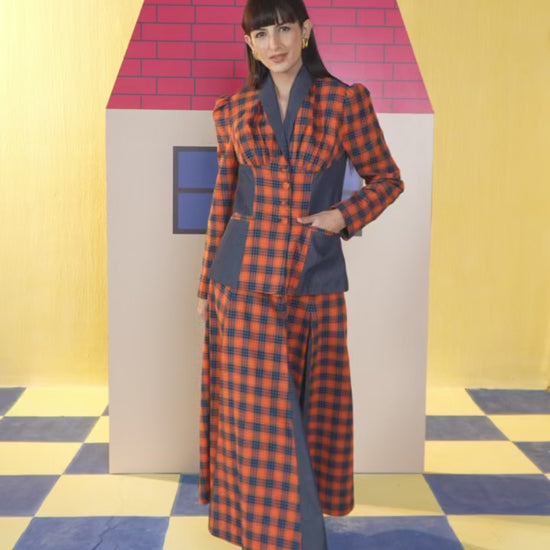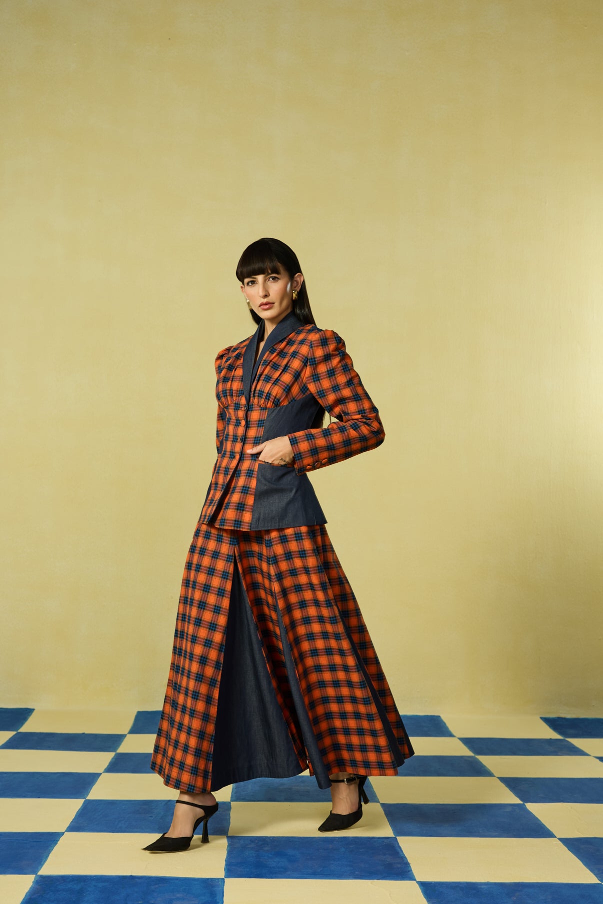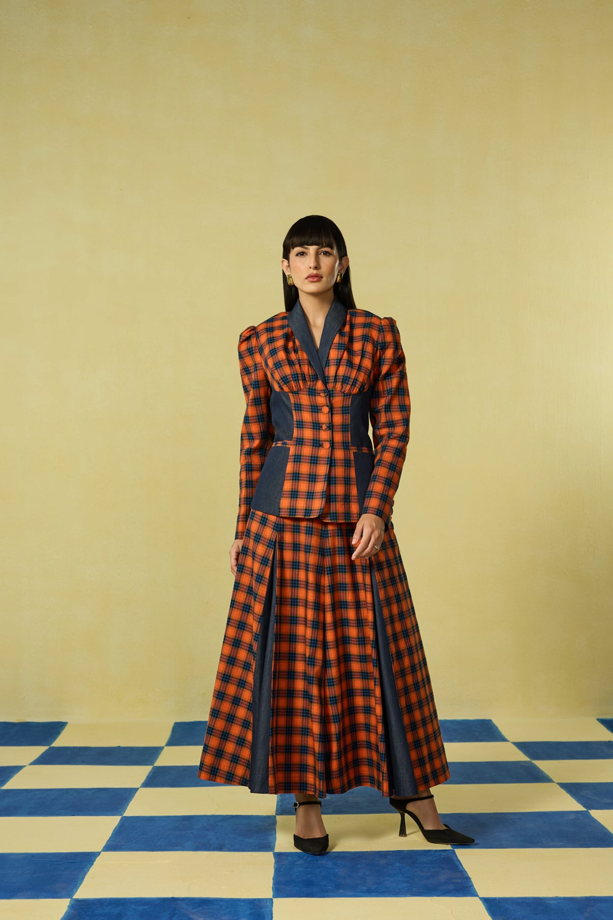 A reimagined take on the classic check, this monochrome co-ord set brings structure and edge into perfect harmony. The tailored shirt, designed with crisp white accents and a lace-up back, offers a sculpted silhouette with a hint of playfulness. Paired with a wrap-style mini skirt featuring solid contrast panels and layered detailing, the look exudes contemporary charm with timeless appeal