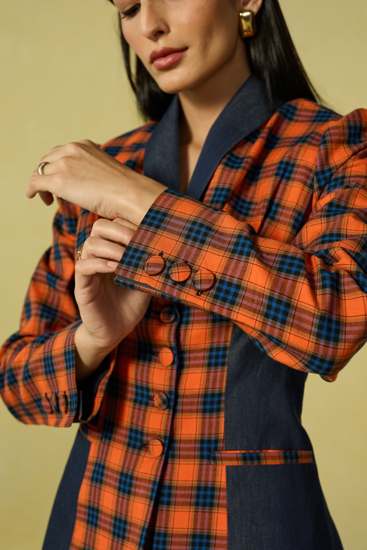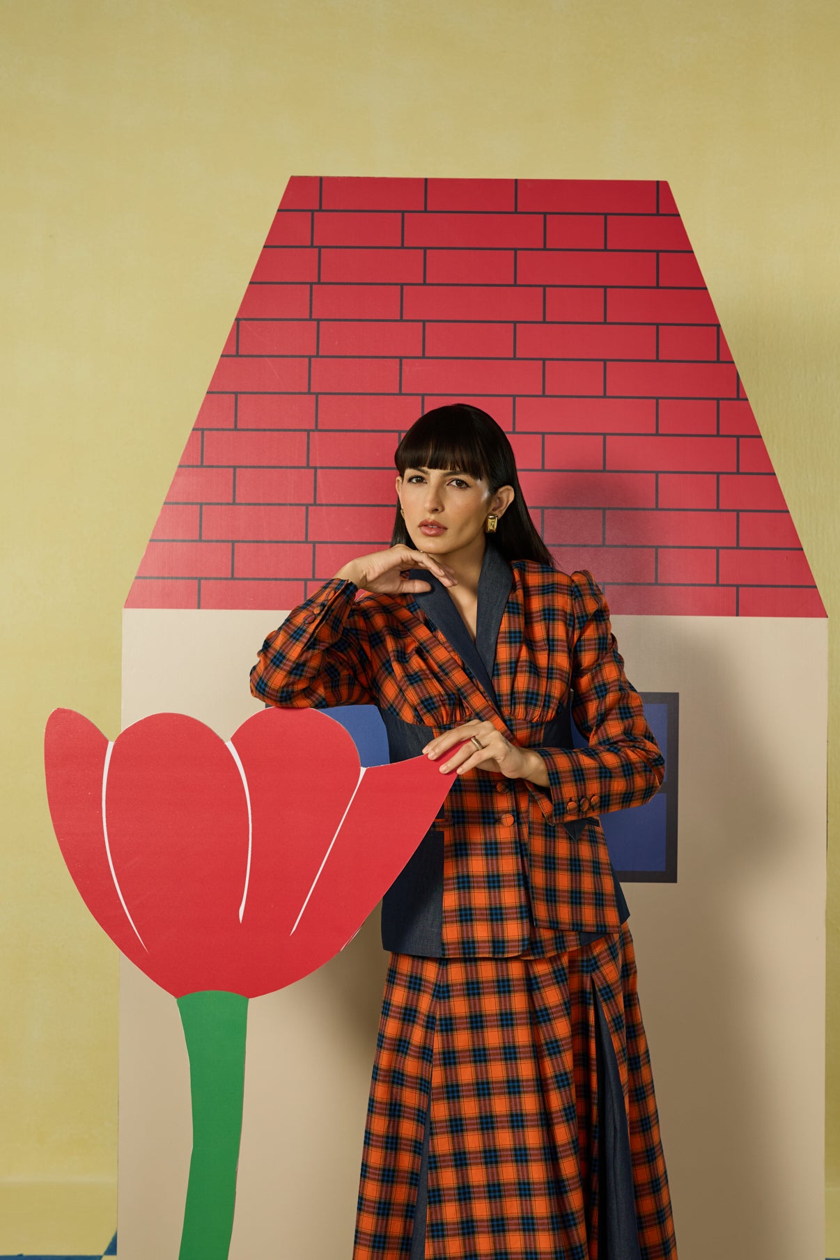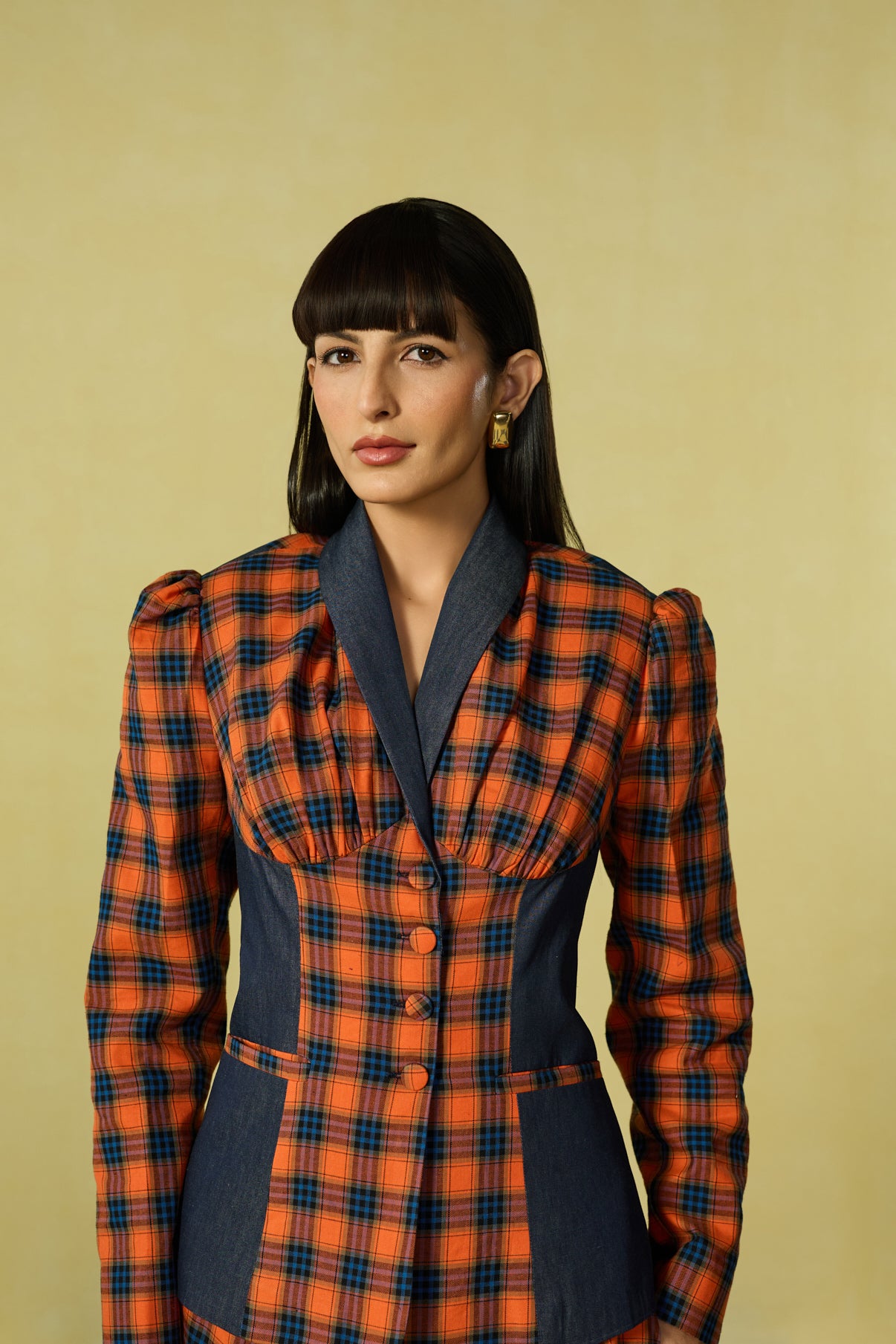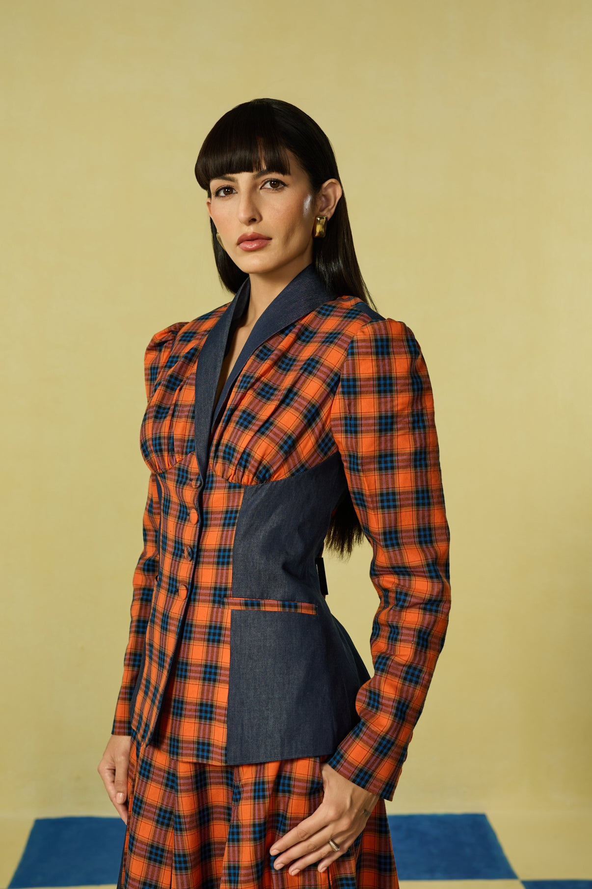 A reimagined take on the classic check, this monochrome co-ord set brings structure and edge into perfect harmony. The tailored shirt, designed with crisp white accents and a lace-up back, offers a sculpted silhouette with a hint of playfulness. Paired with a wrap-style mini skirt featuring solid contrast panels and layered detailing, the look exudes contemporary charm with timeless appeal