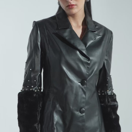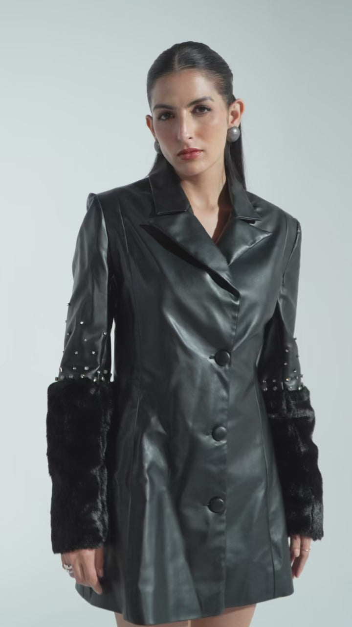 Make a striking winter statement in our black blazer dress crafted in luxe leather. Designed with a sculpted tailored silhouette, this piece features dramatic plush faux-fur sleeves for that rich winter texture and warmth. The sleeves are further elevated with delicate hand beaded detailing – adding a subtle sparkle that catches light beautifully. Strong, bold, and undeniably chic – this blazer dress is your power winter essential for night outs, events, and luxe evenings. Style it with heels and a slick bun for that high-fashion, cold-season glamour.