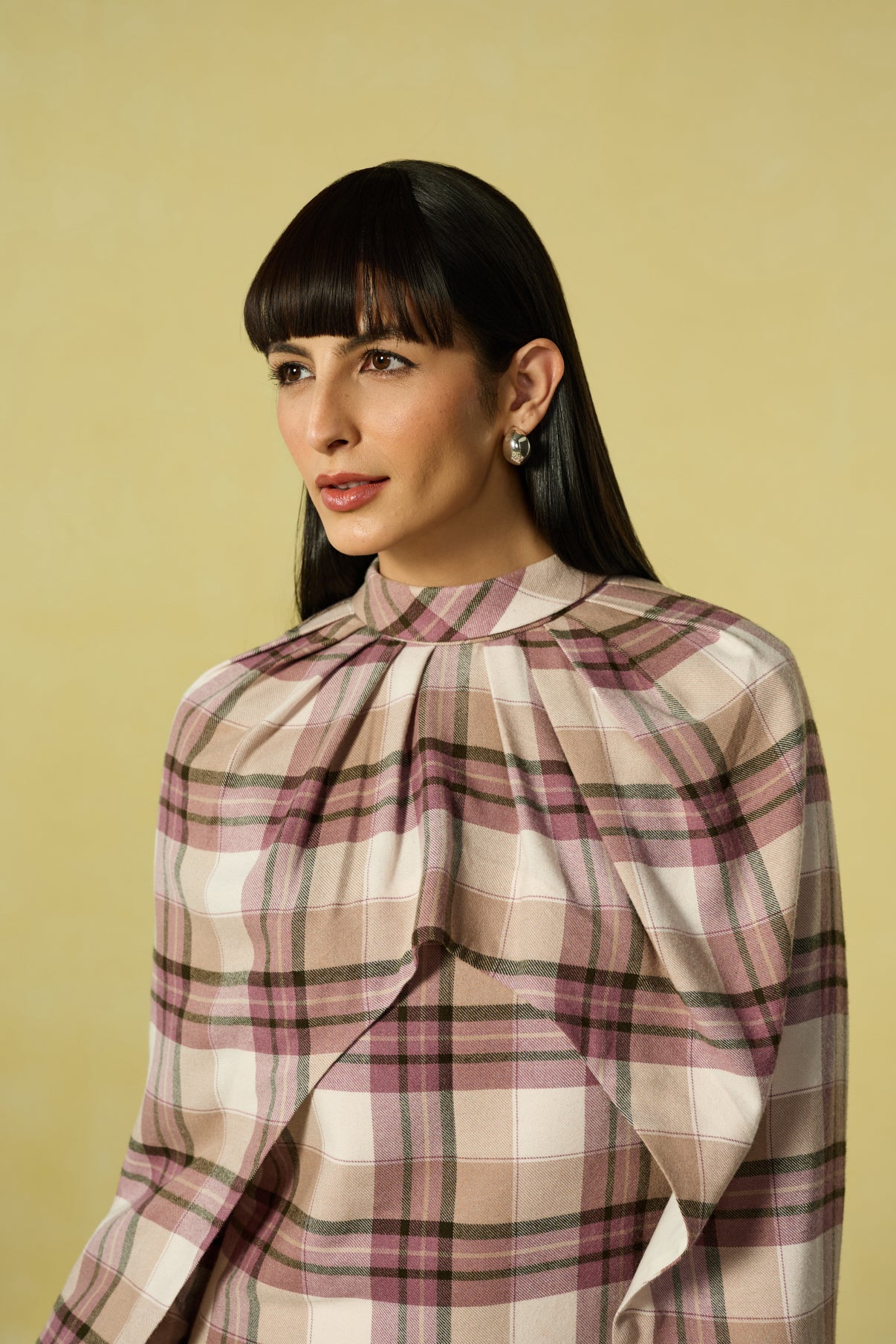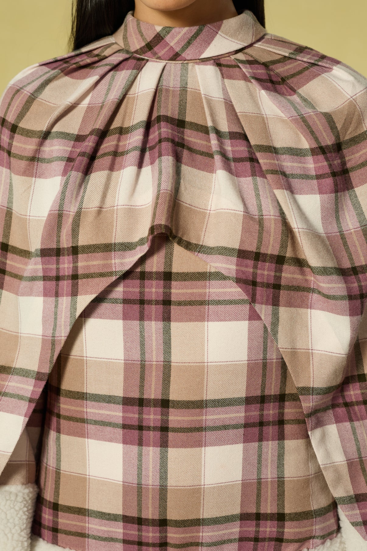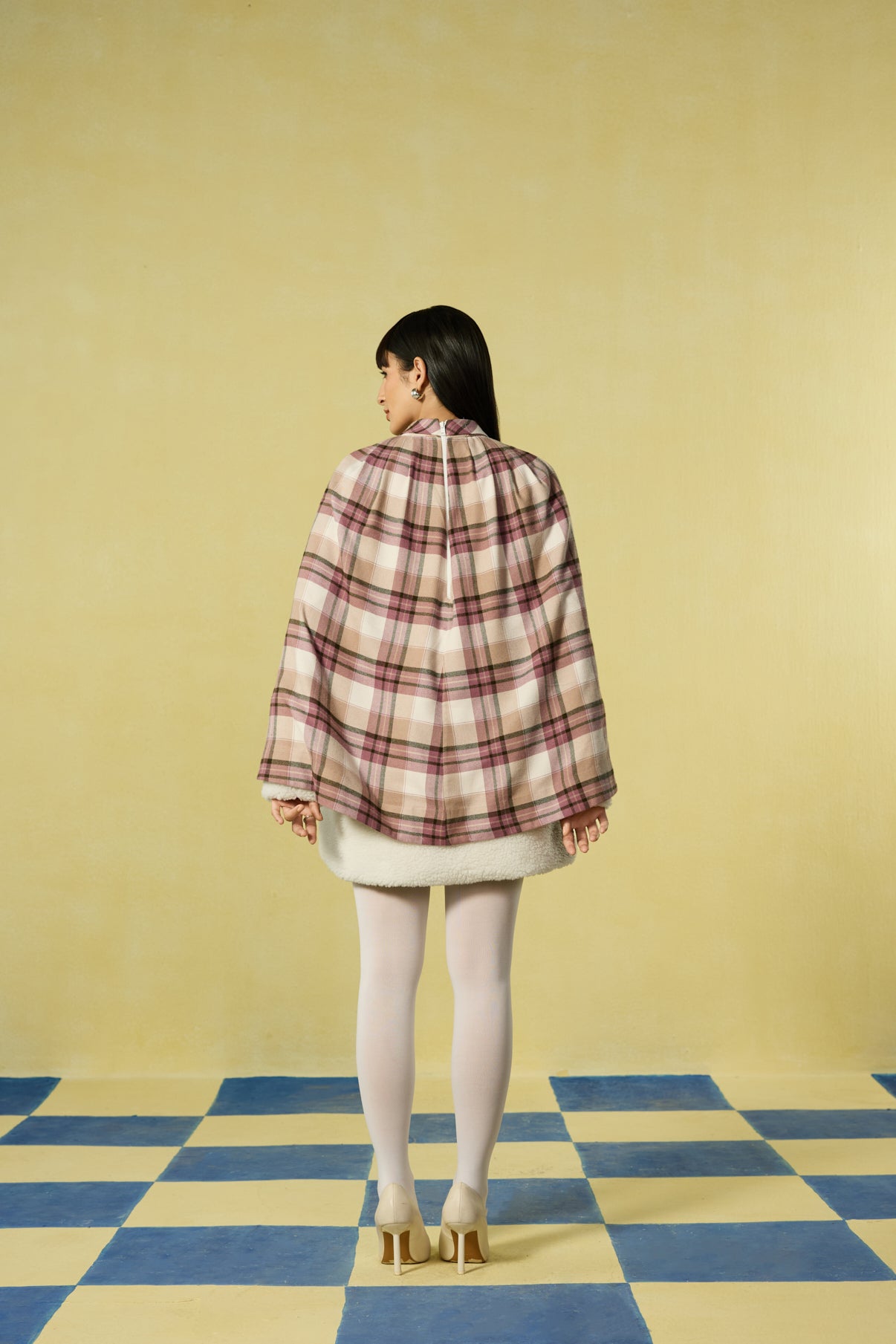 A playful twist on winter nostalgia, this dress blends cozy texture with structured elegance. The upper half features soft blush and mauve checks, detailed with a draped front that opens into a gentle cape-like silhouette. The plush white fleece hem and cuffs add warmth and contrast, creating a tactile mix of comfort and chic. Finished with a mini length and clean lines, this piece embodies contemporary retro charm — equal parts whimsical and polished.