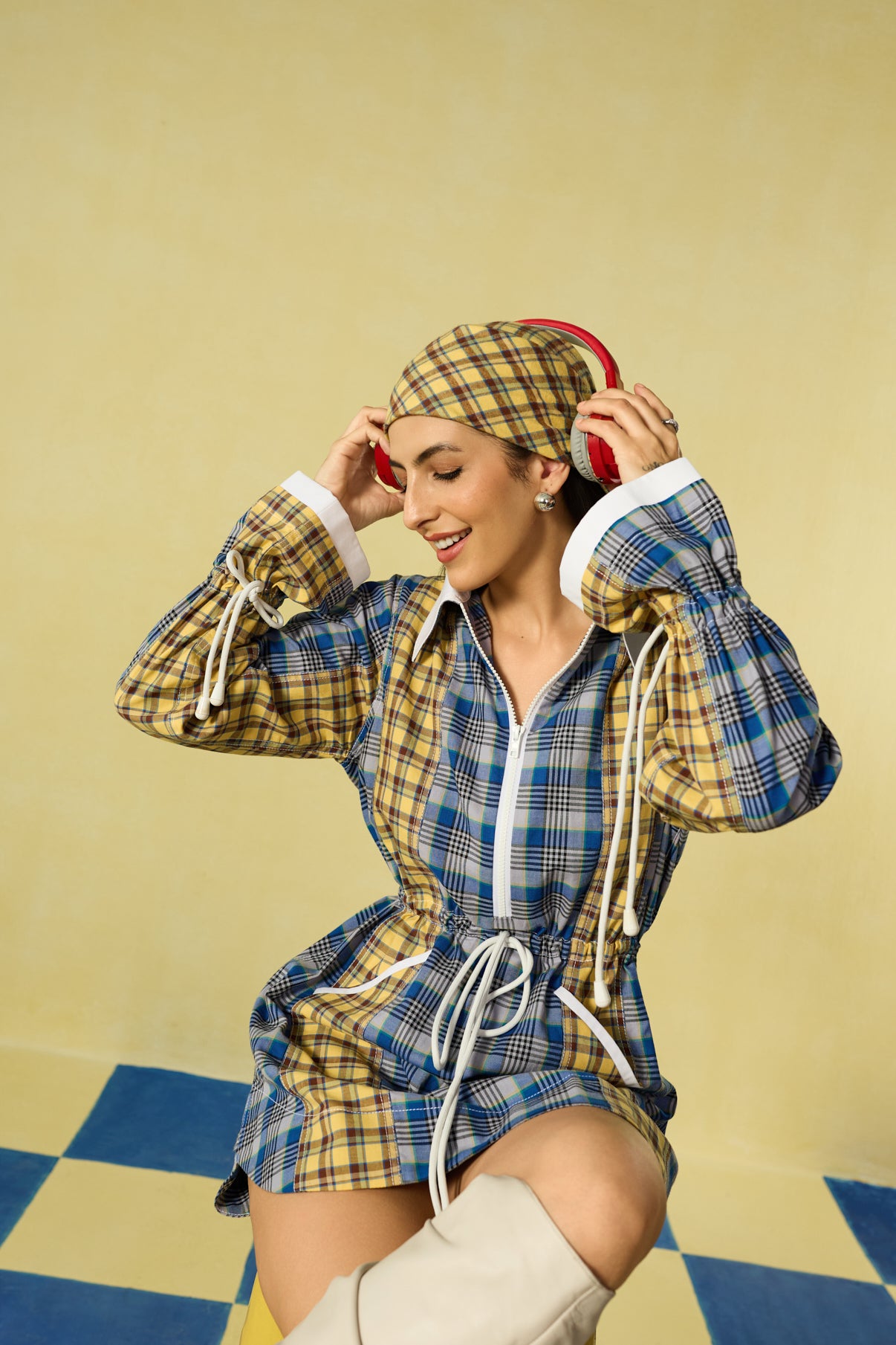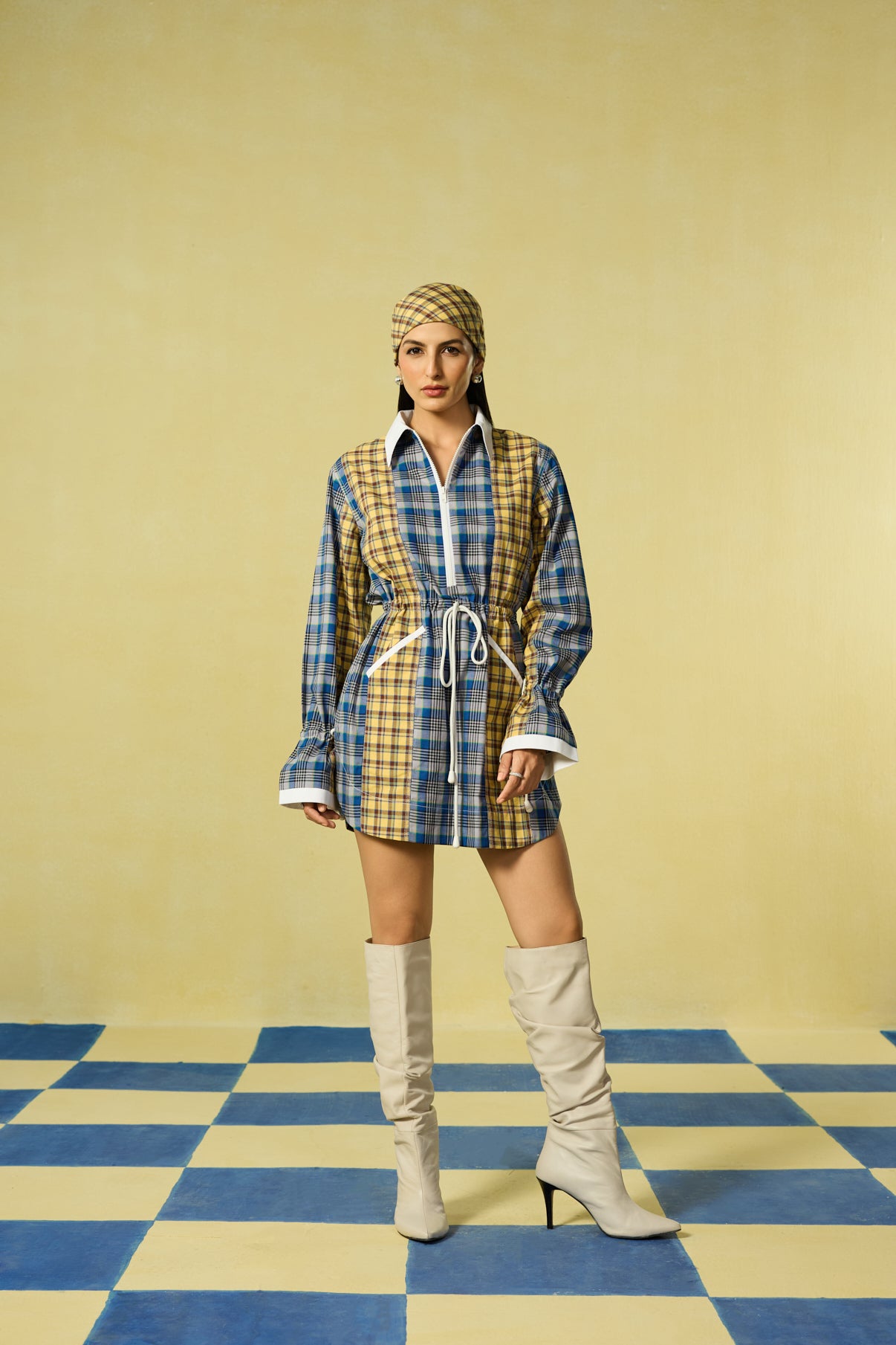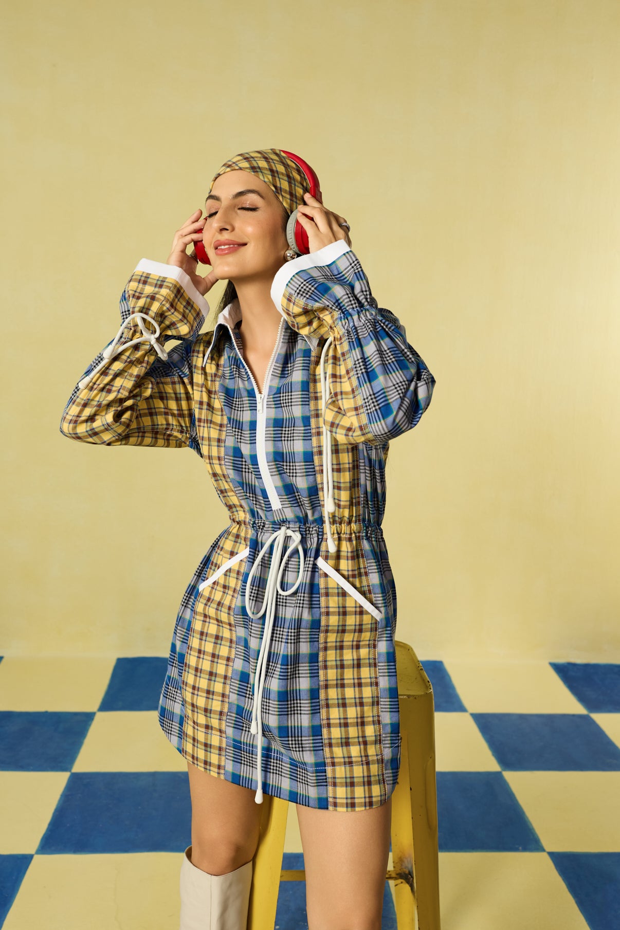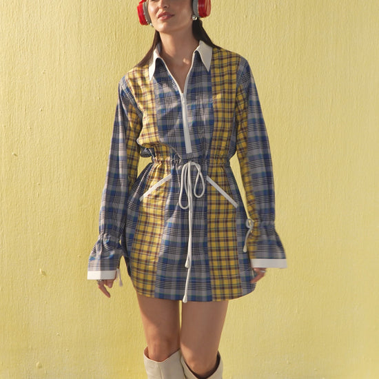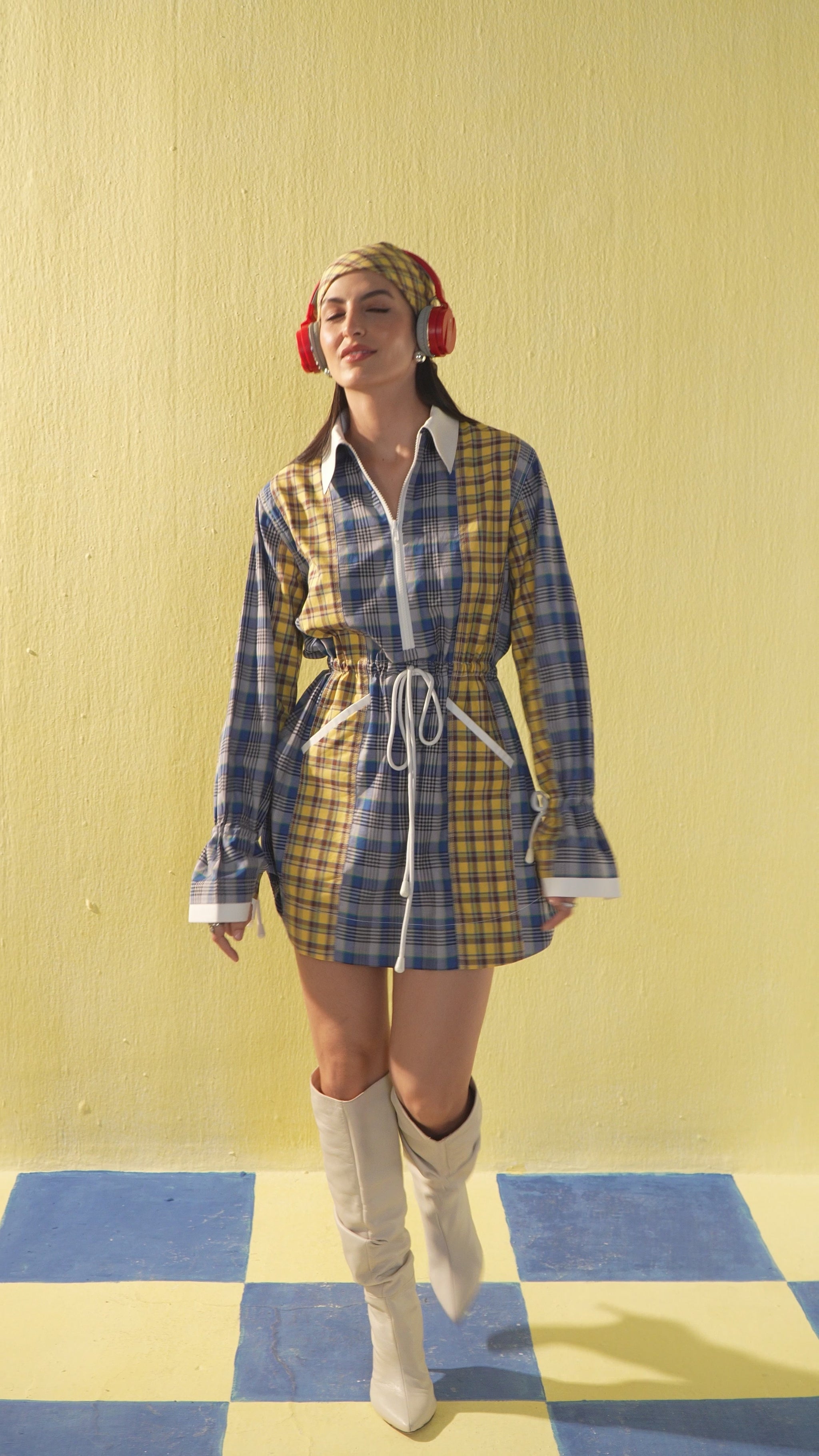 A vibrant reimagination of the signature check dress, this version pairs sunny yellow with cool blue for a fresh, playful contrast. Designed with a collared neckline, half-zip front, and statement white accents, it features a drawstring waist for a cinched silhouette. The flared cuffs and heart detail add a touch of whimsy — a perfect balance of preppy charm and easygoing modernity.