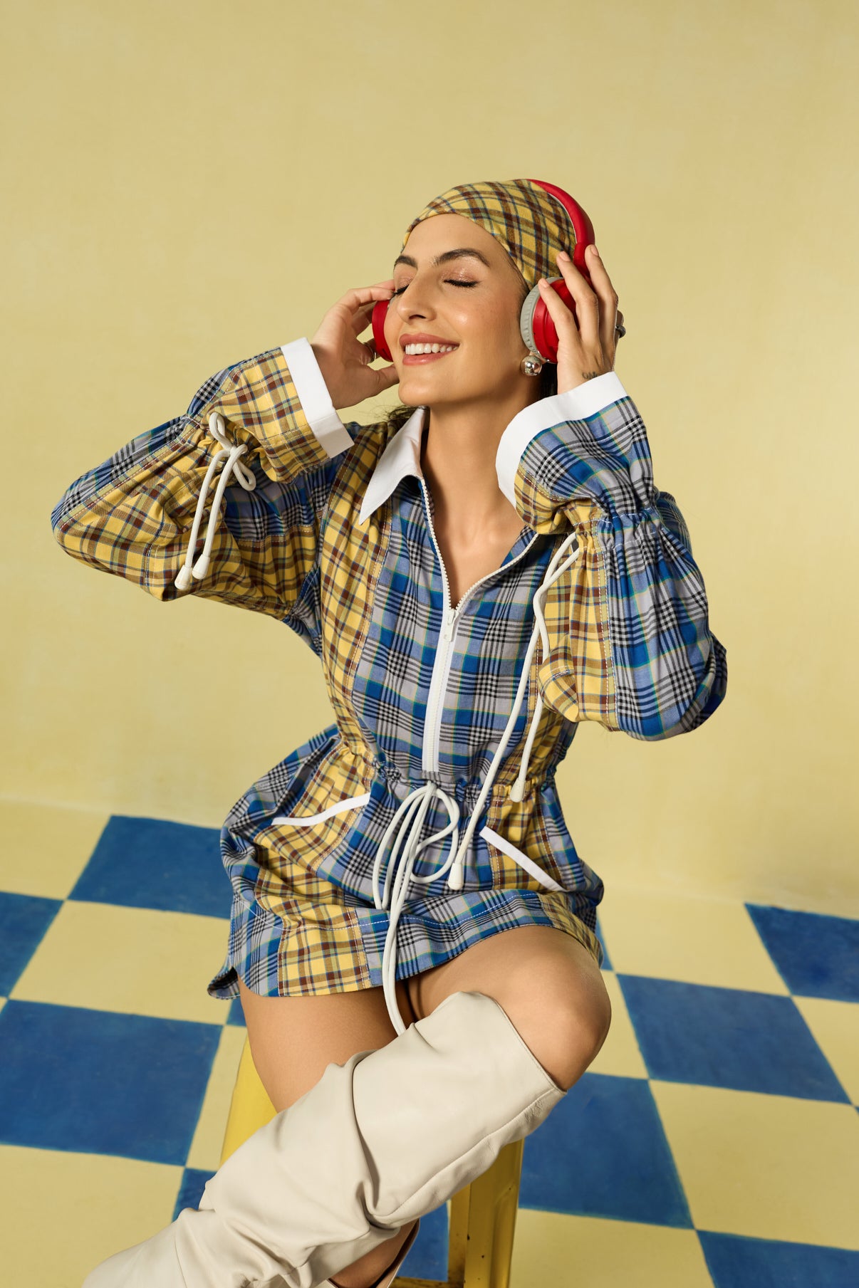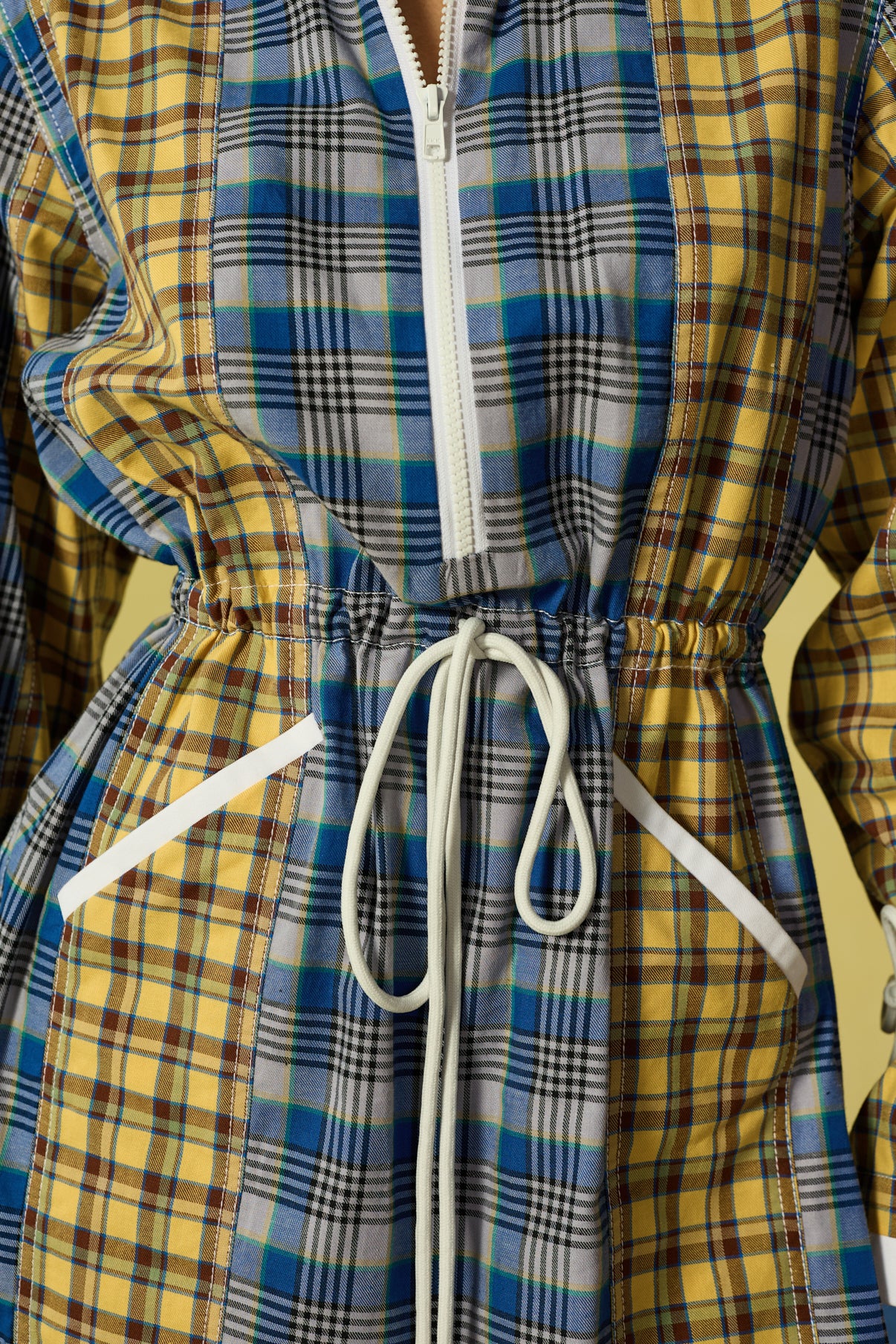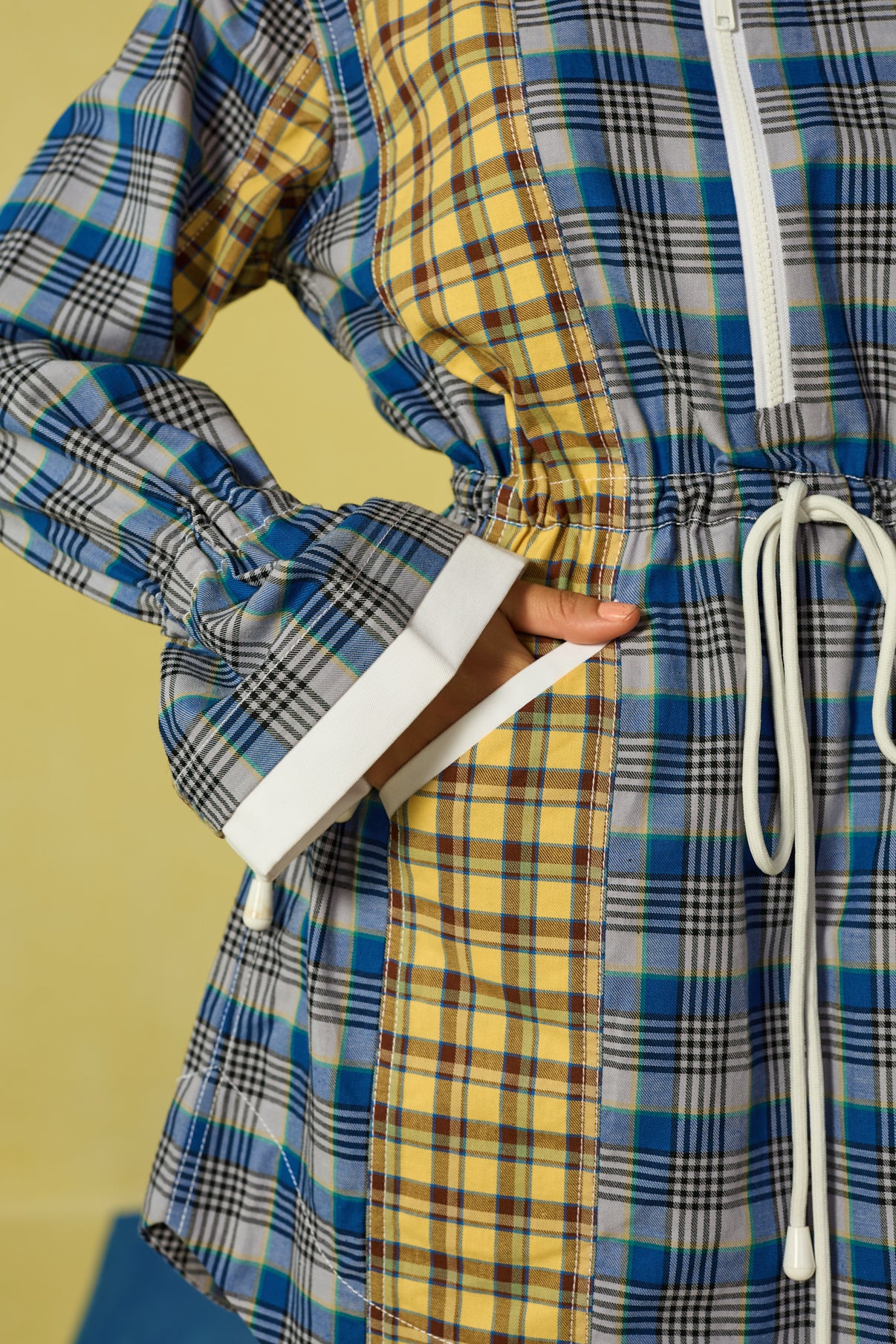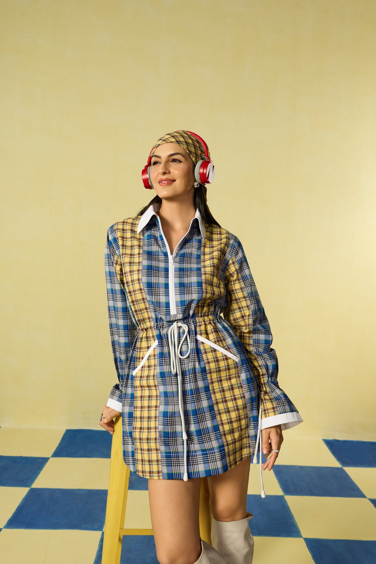 A vibrant reimagination of the signature check dress, this version pairs sunny yellow with cool blue for a fresh, playful contrast. Designed with a collared neckline, half-zip front, and statement white accents, it features a drawstring waist for a cinched silhouette. The flared cuffs and heart detail add a touch of whimsy — a perfect balance of preppy charm and easygoing modernity.