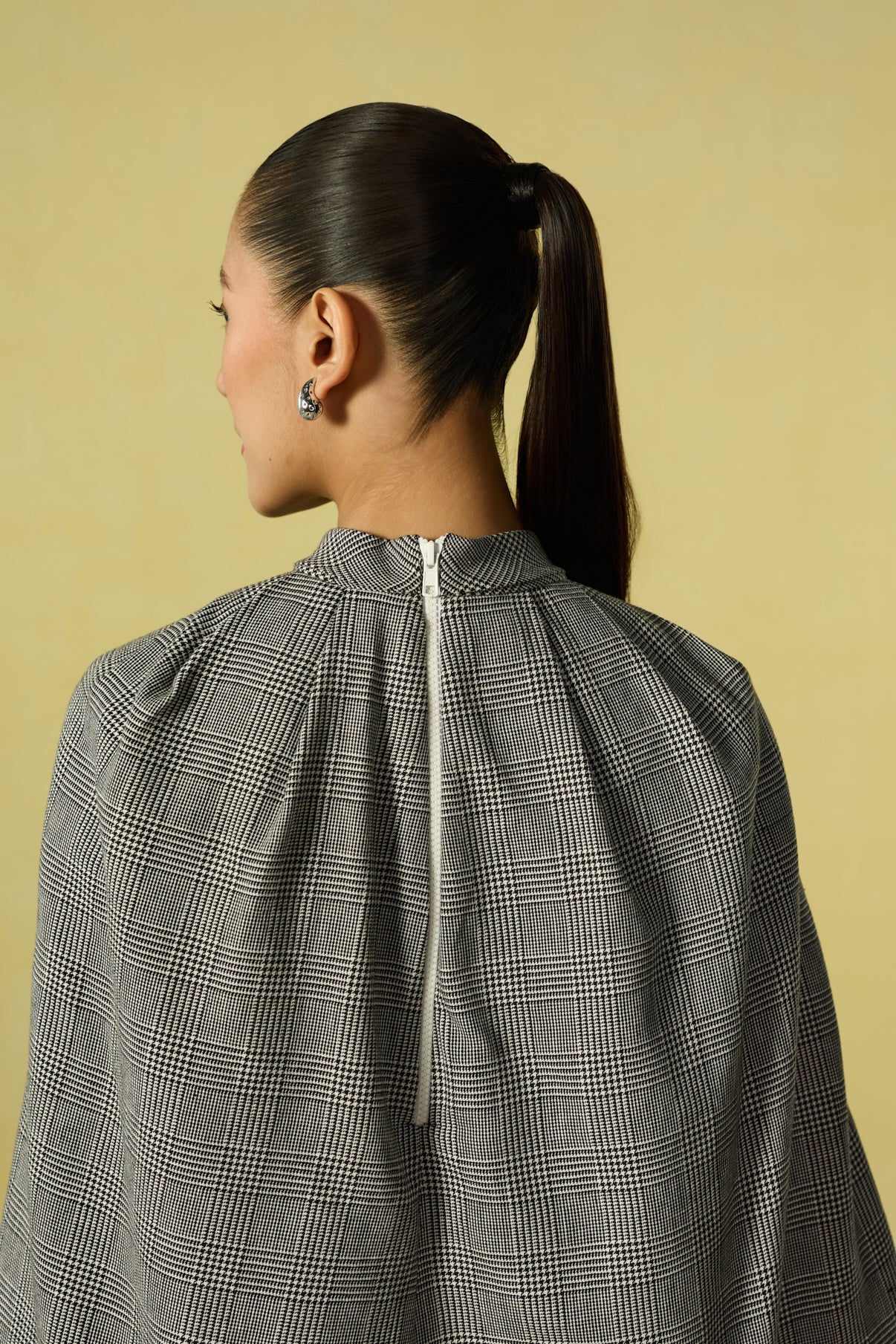 A modern nod to vintage silhouettes, this dress pairs classic grey checks with plush winter textures. The softly draped front opens into a cape-like overlay, lending movement and structure in equal measure. The contrast white fleece hem and cuffs add a cozy, tactile finish, balancing warmth with refined minimalism.