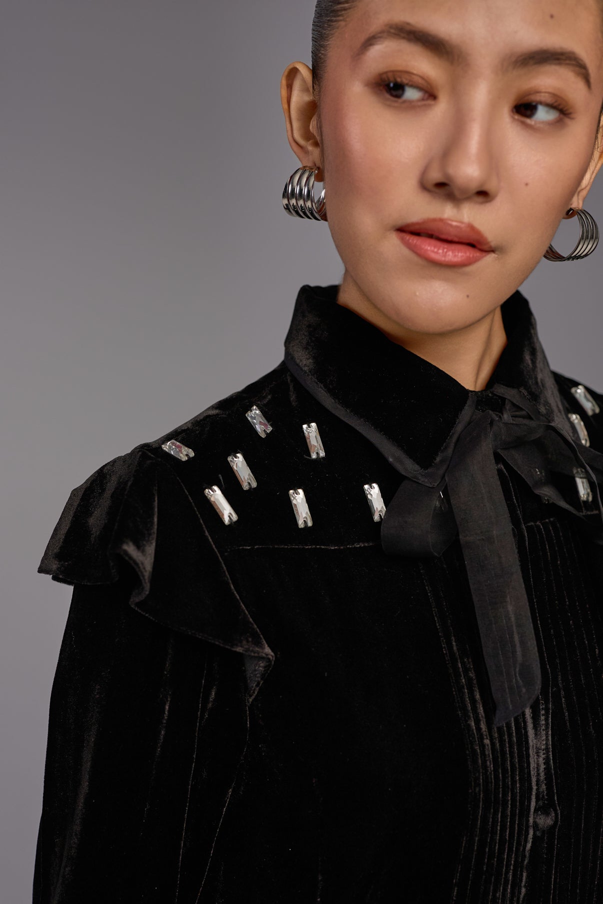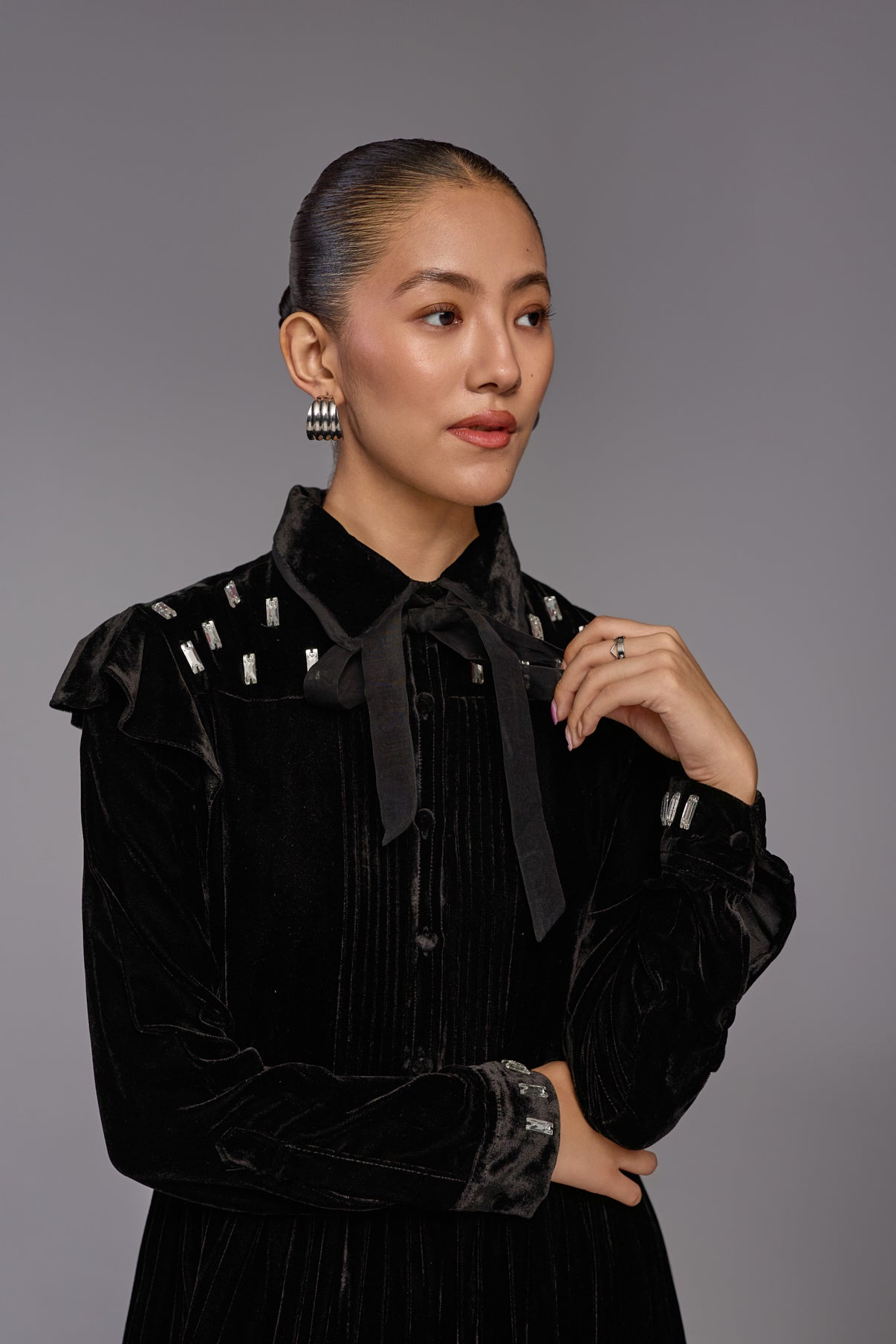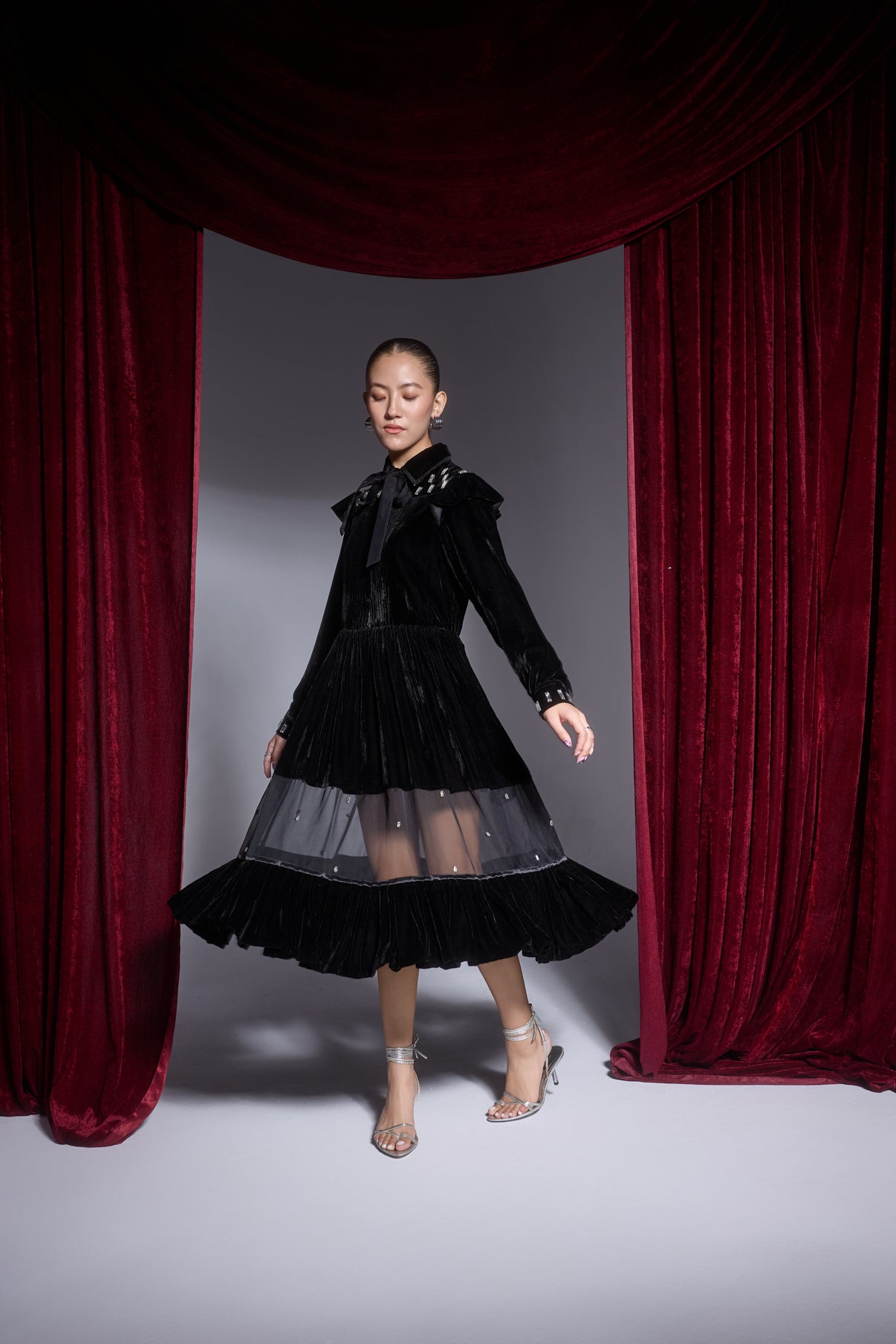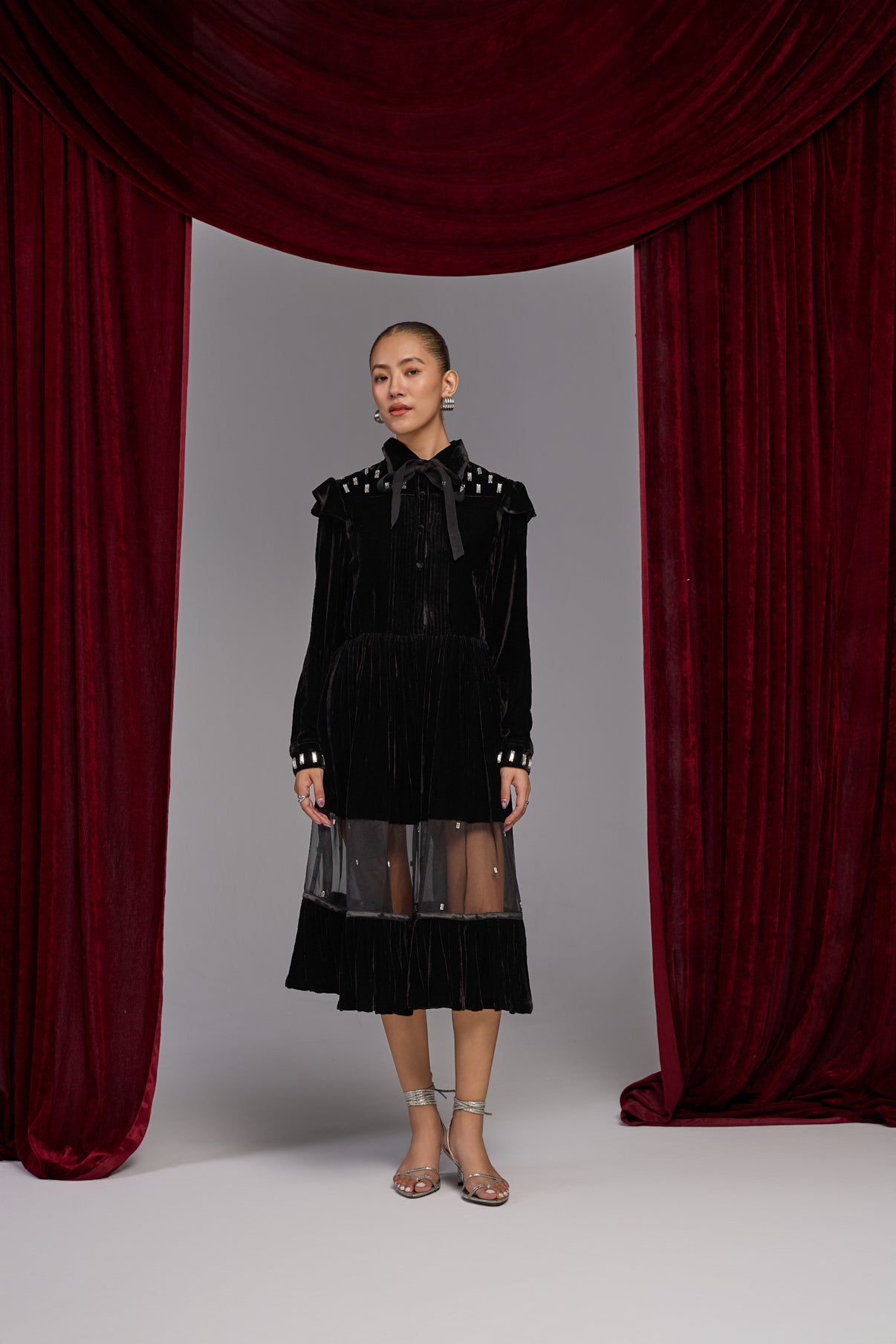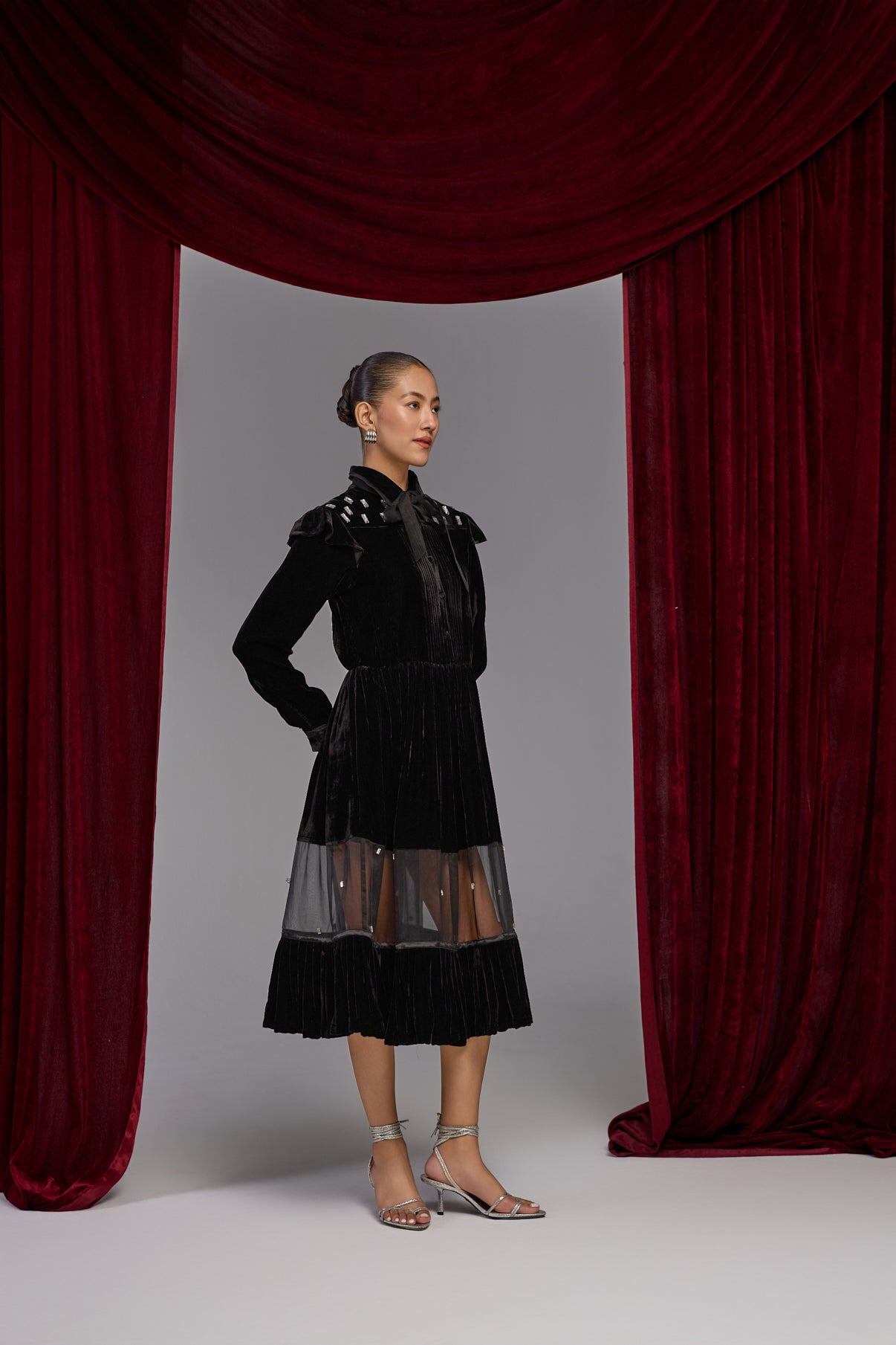 A black midi dress in silk velvet exudes timeless elegance with its rich, luxurious texture. The soft, smooth fabric drapes beautifully over the body, creating a flattering, figure-skimming silhouette. The deep black hue enhances the dress's sophisticated appeal, while the velvet adds a touch of opulence and depth.