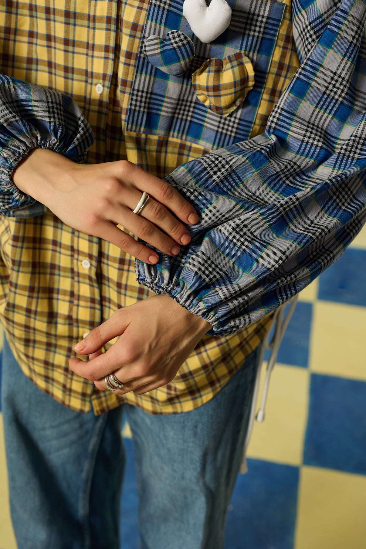 A vibrant reinvention of checks — this shirt blends warm yellow tones with cool blue plaid sleeves for a playful contrast. The relaxed, oversized silhouette is detailed with side drawstrings, allowing you to adjust the fit to your mood. Finished with a crisp white collar and a mixed-check pocket accent.