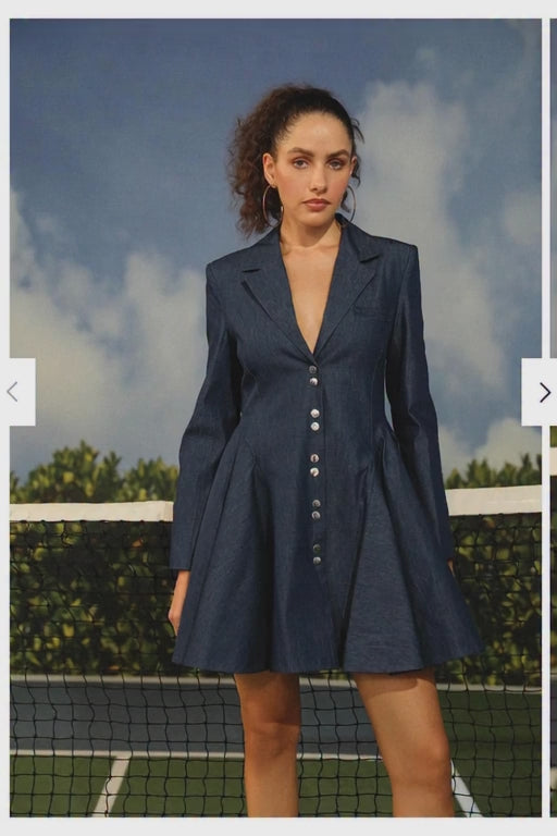 This unique denim dress stands out with its distinctive button detailing, adding a modern twist to the classic denim look. The buttons are creatively arranged, making them a focal point that enhances the dress's stylish, contemporary vibe