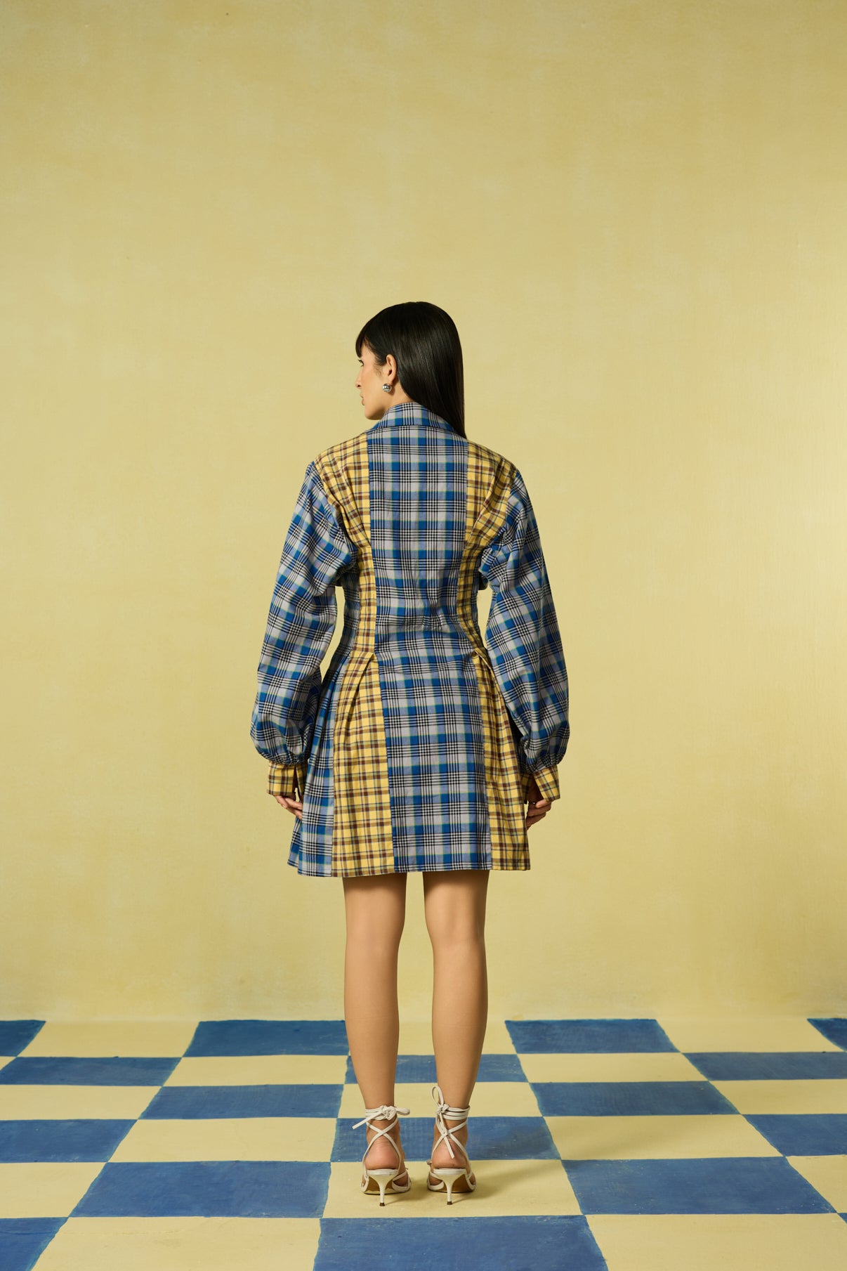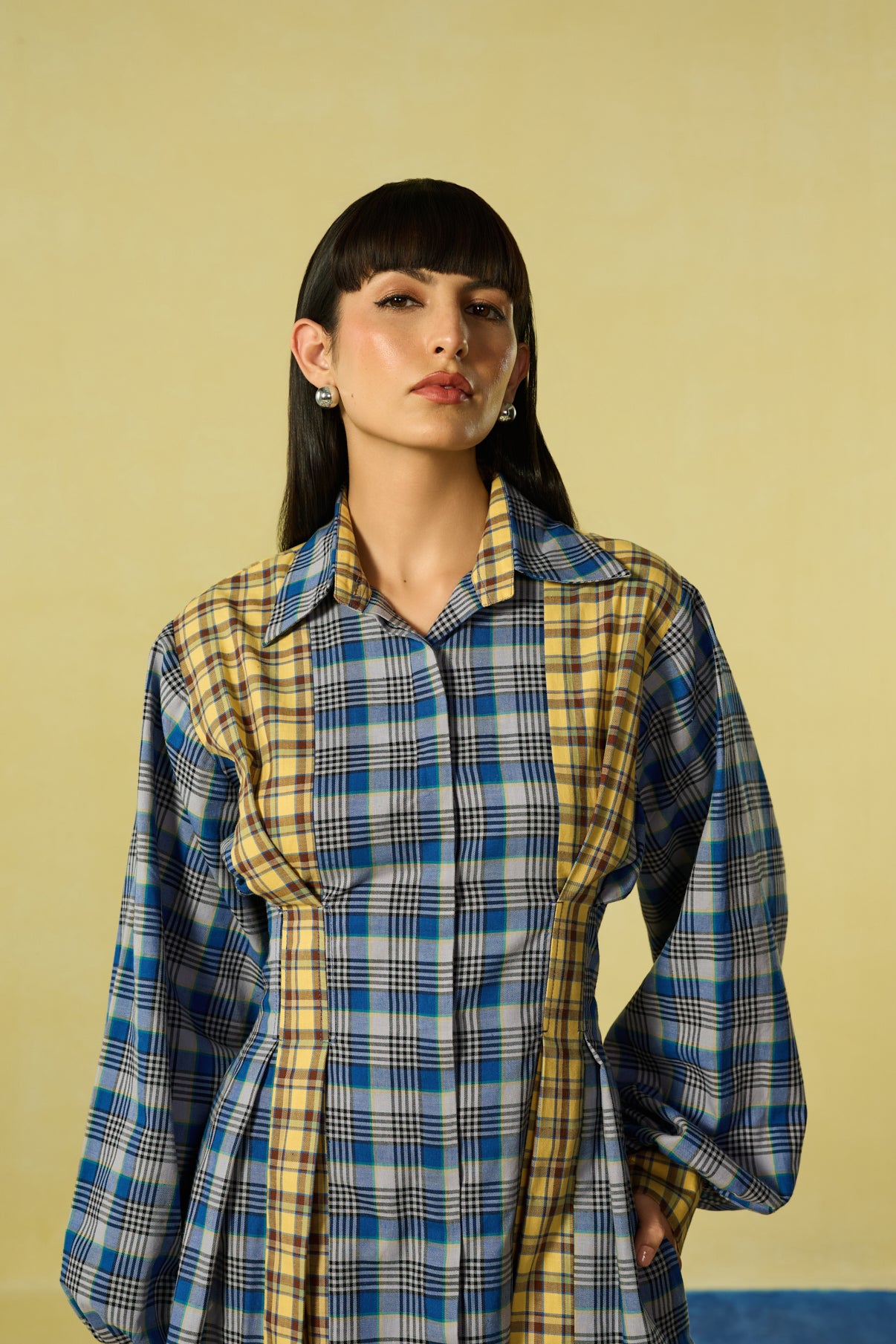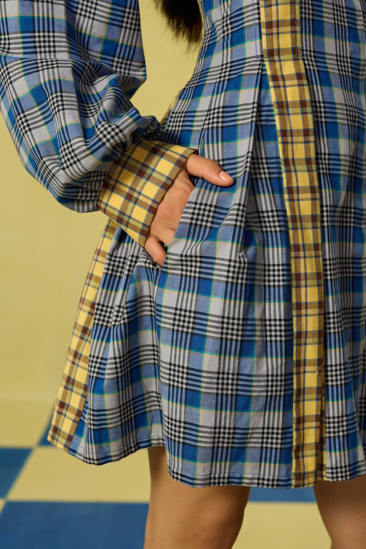 A playful nod to retro charm, this blue check dress is defined by its structured silhouette and precise tailoring. Featuring sharp pleats with subtle yellow inserts that move with ease, the dress balances a preppy mood with modern sophistication. The collared neckline and contrast detailing at the placket and cuffs lend it a polished finish