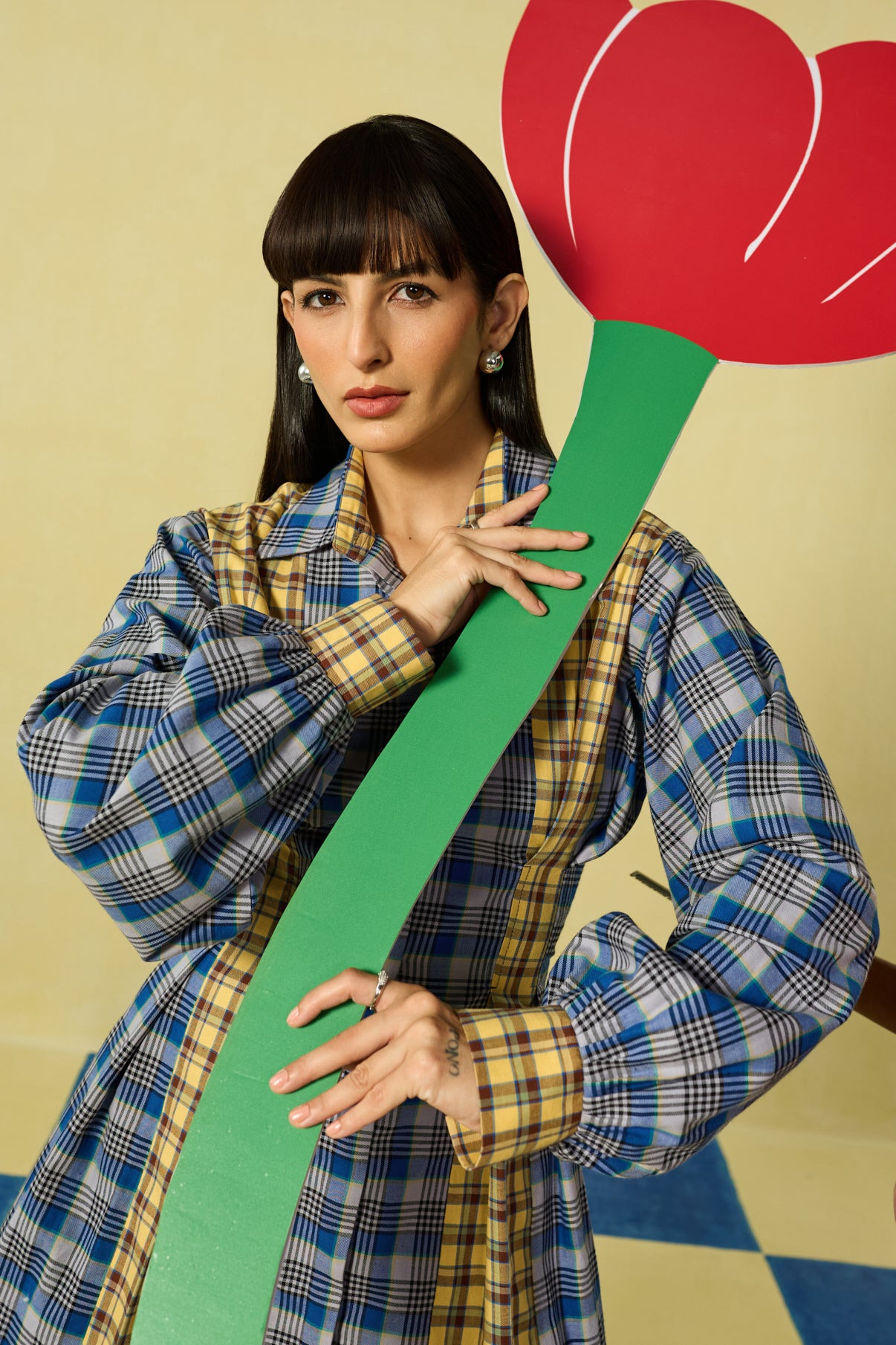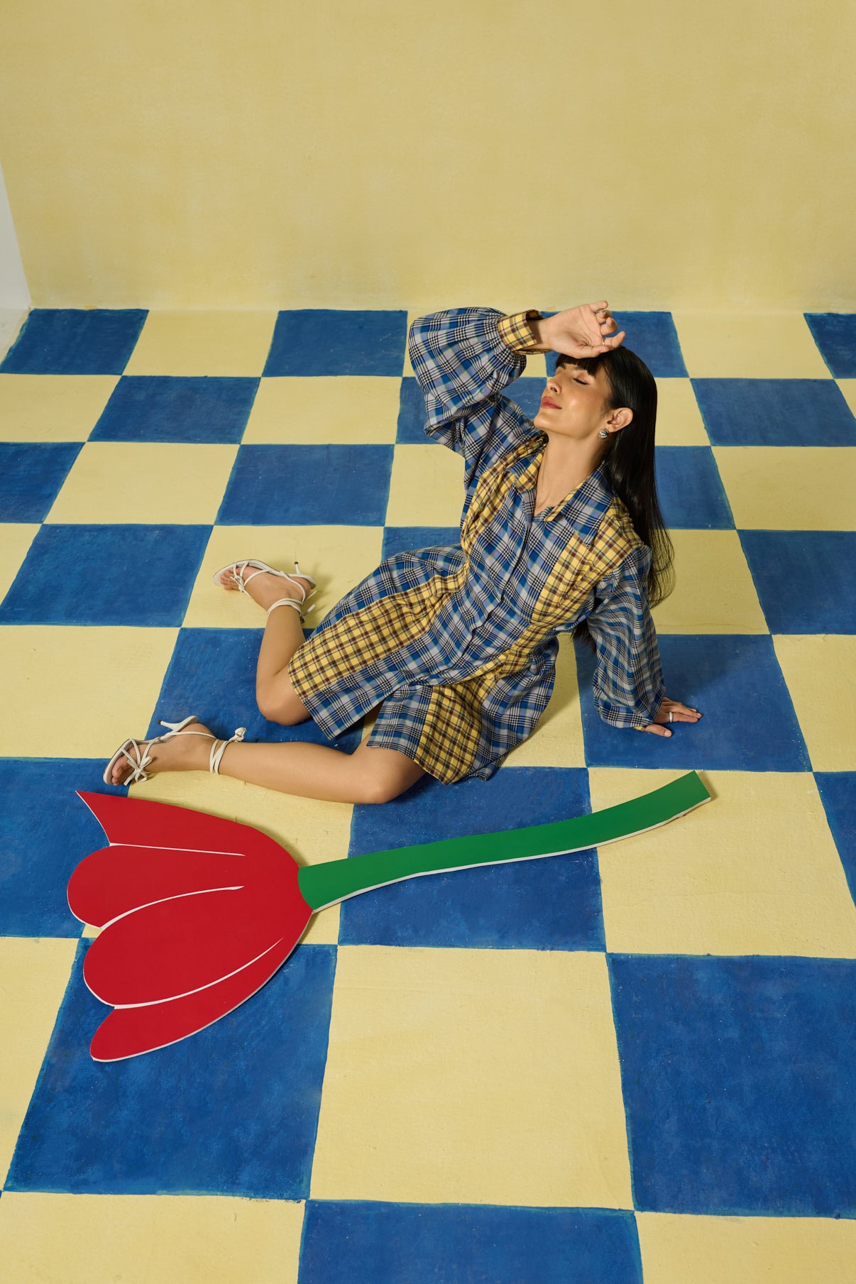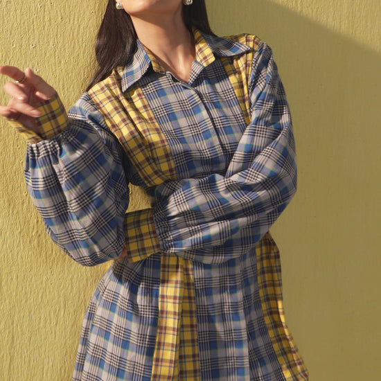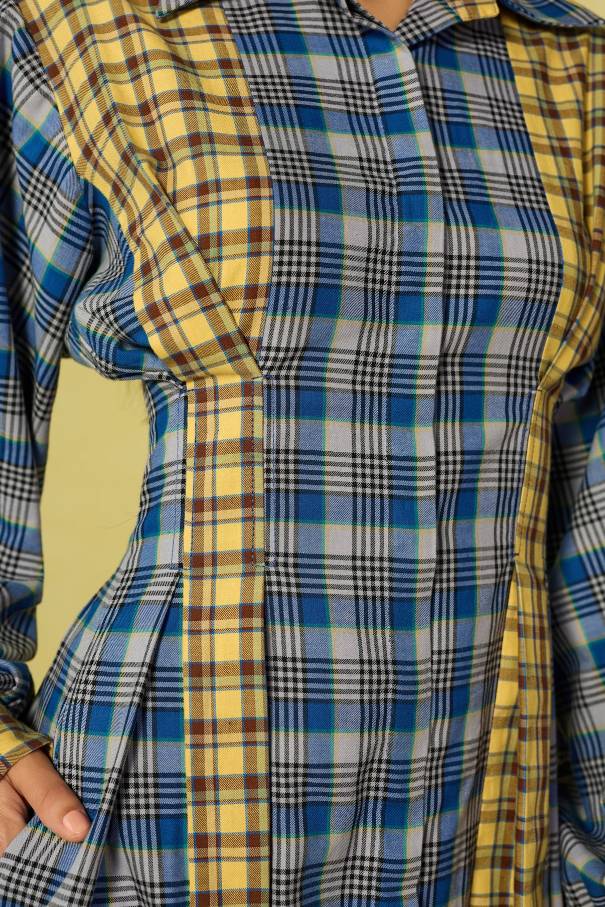 A playful nod to retro charm, this blue check dress is defined by its structured silhouette and precise tailoring. Featuring sharp pleats with subtle yellow inserts that move with ease, the dress balances a preppy mood with modern sophistication. The collared neckline and contrast detailing at the placket and cuffs lend it a polished finish