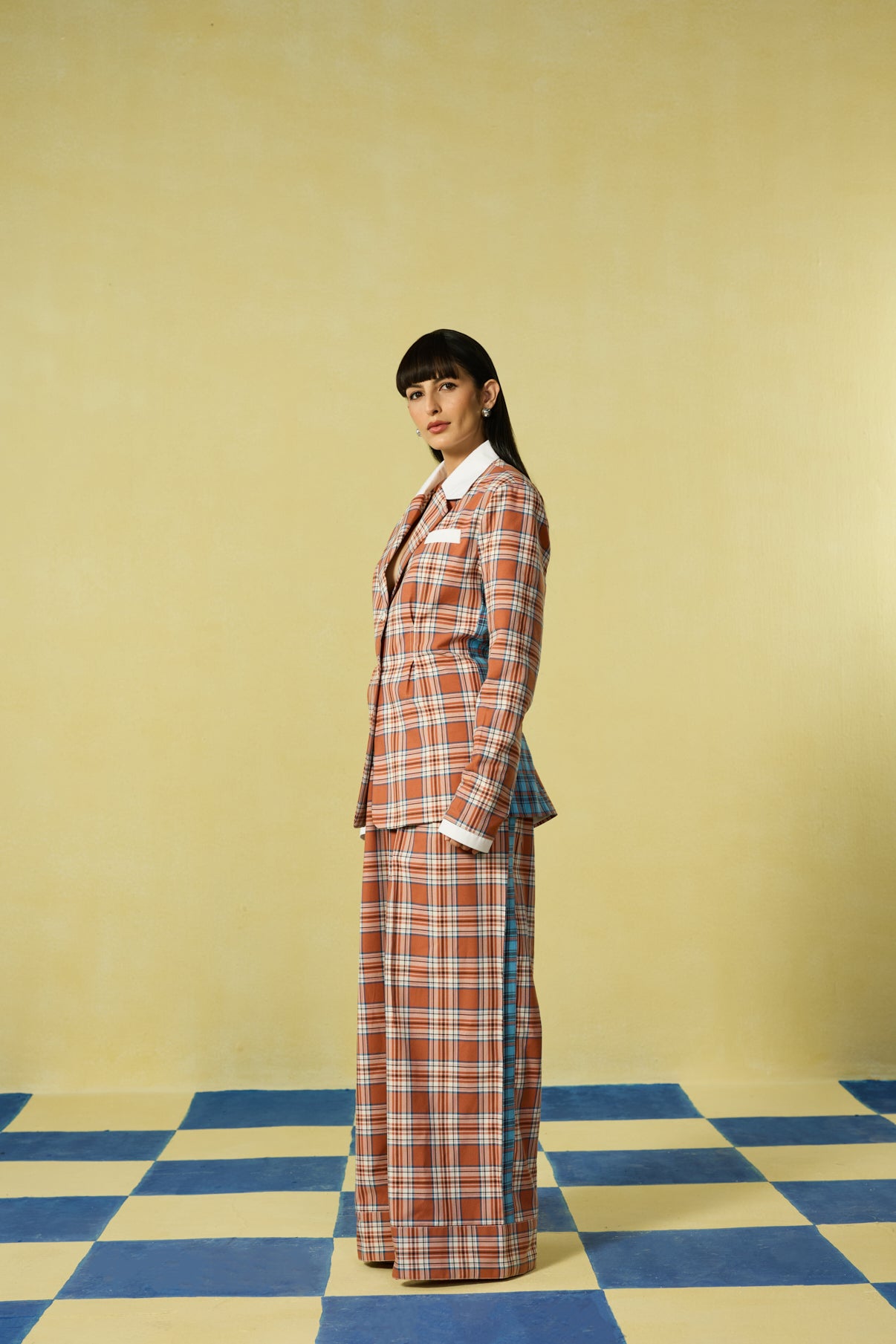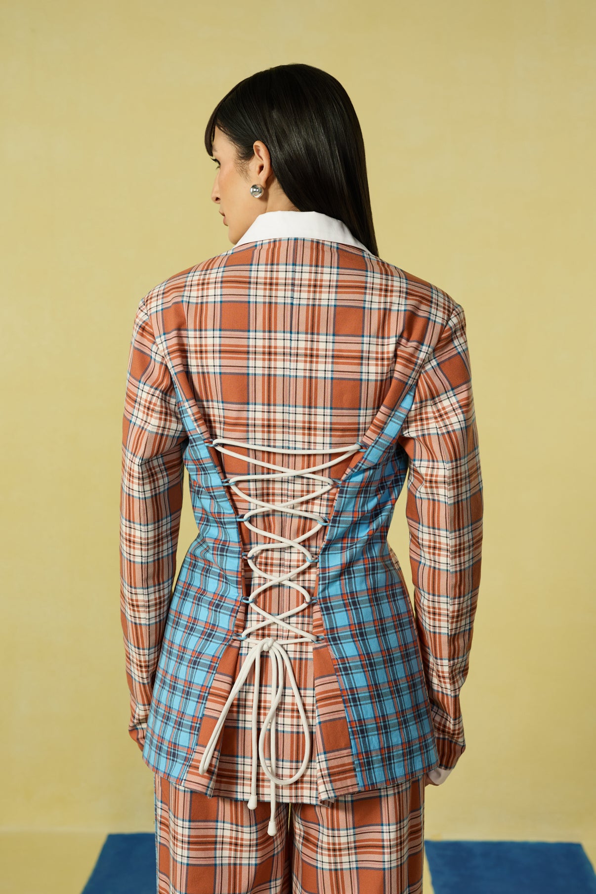 A bold play on structure and checks, this co-ord set redefines power dressing with a playful twist. Tailored in a orange and ivory plaid pattern, the blazer features a sharp white collar, exaggerated cuffs, and a statement lace-up back in contrasting blue checks — blending edge with elegance. Paired with matching wide-leg trousers, the silhouette balances retro charm with modern tailoring. Perfect for those who love to command attention with effortless sophistication.