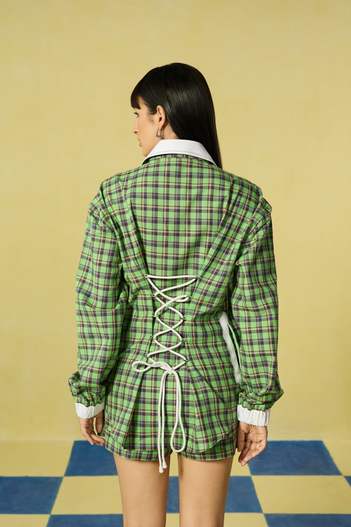 Playful yet polished, this green plaid co-ord set brings a preppy update to contemporary tailoring. The relaxed shirt features a crisp white collar, zip-down front, and signature heart pocket detailing, paired effortlessly with matching tailored shorts for a coordinated finish. The highlight — a contrast plaid lace-up back — adds a modern, corseted twist to the otherwise easy silhouette. A statement piece that merges comfort, structure, and bold personality in one look.