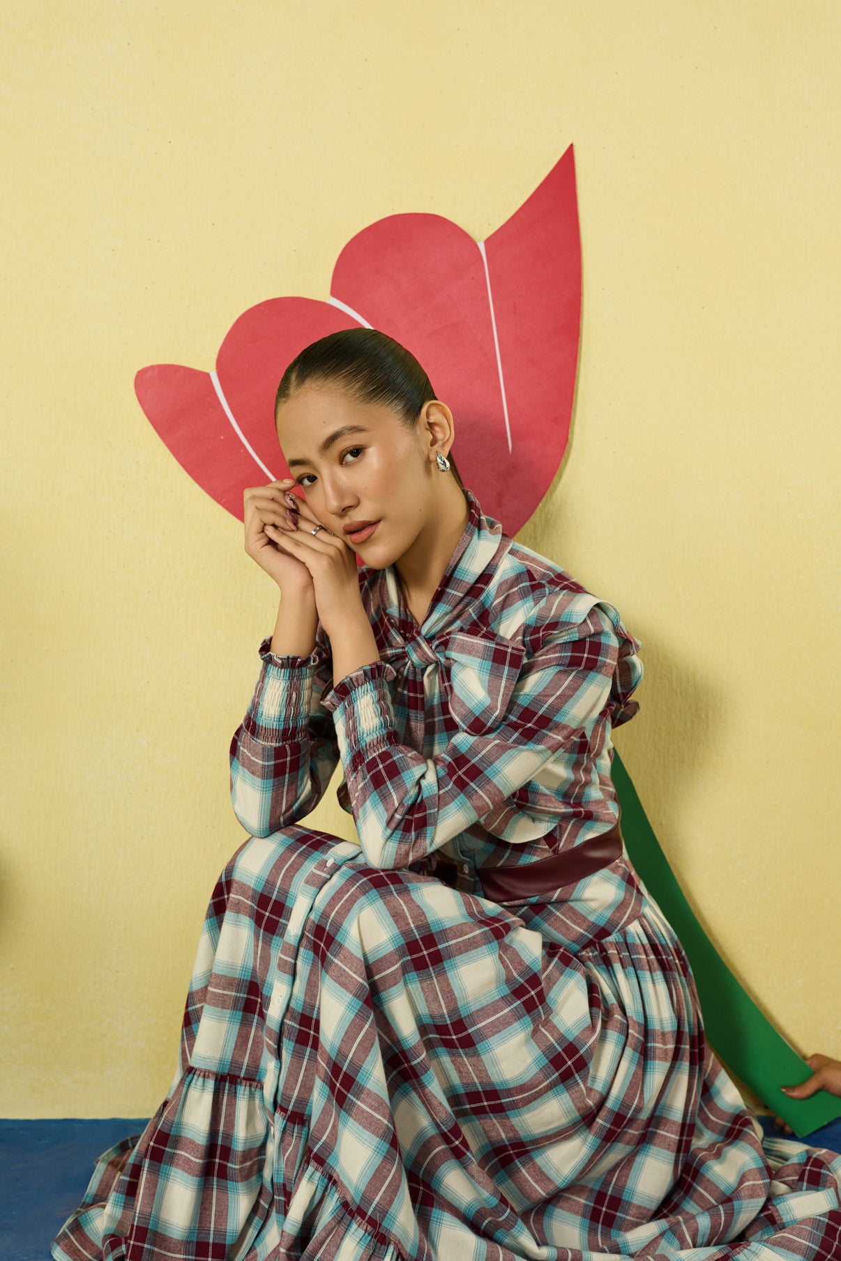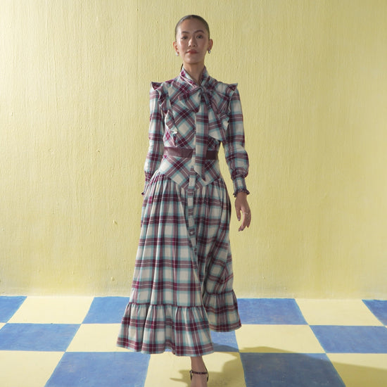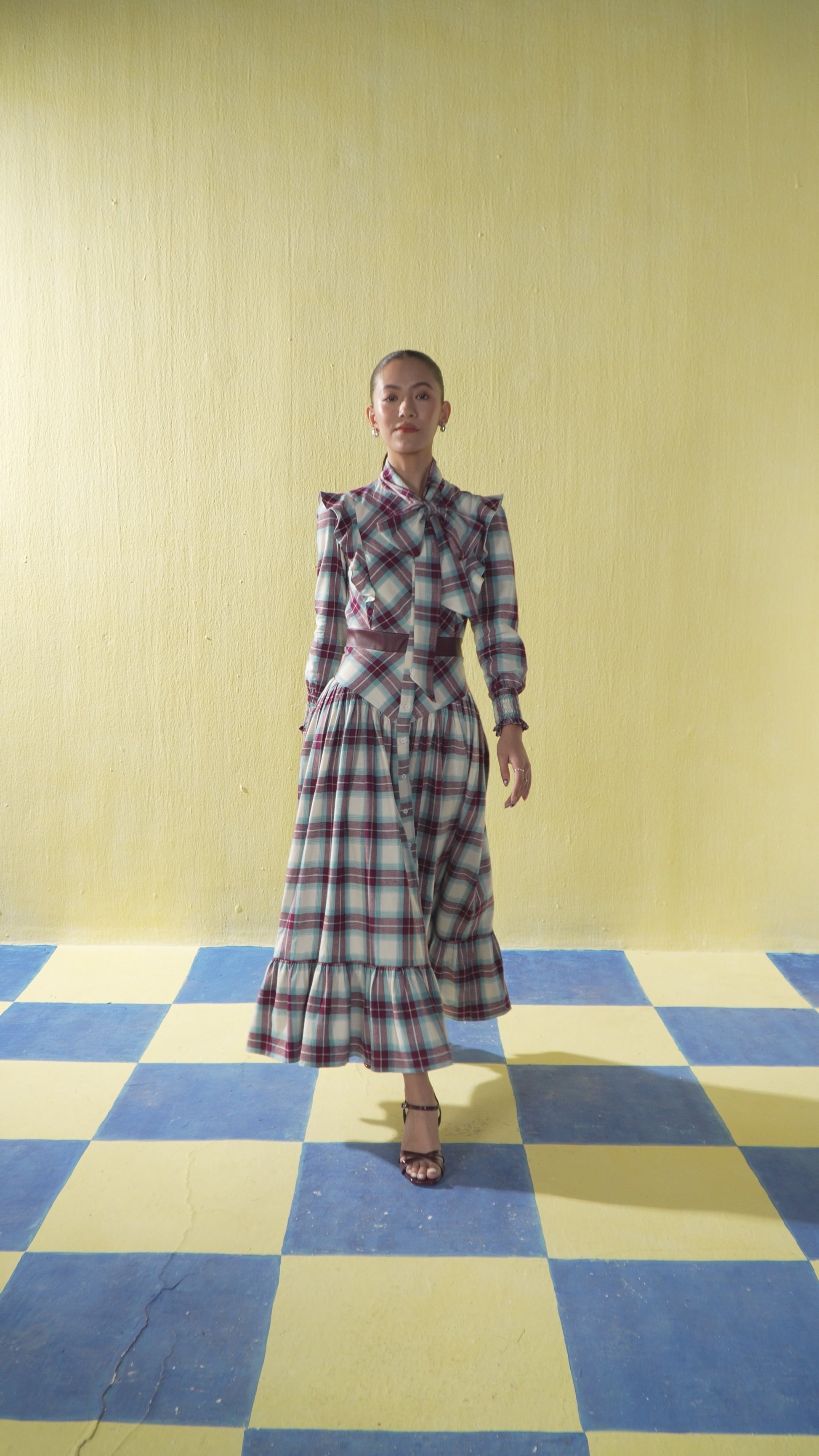 Timeless and feminine, this wine check maxi dress is defined by its elegant tiered silhouette and vintage-inspired detailing. The statement bow at the neck, structured shoulders, and ruffled yoke add a touch of drama, while the cinched waist and flared hem create graceful movement. Crafted in soft checkered fabric with a button-down front, this piece perfectly balances heritage charm with modern poise