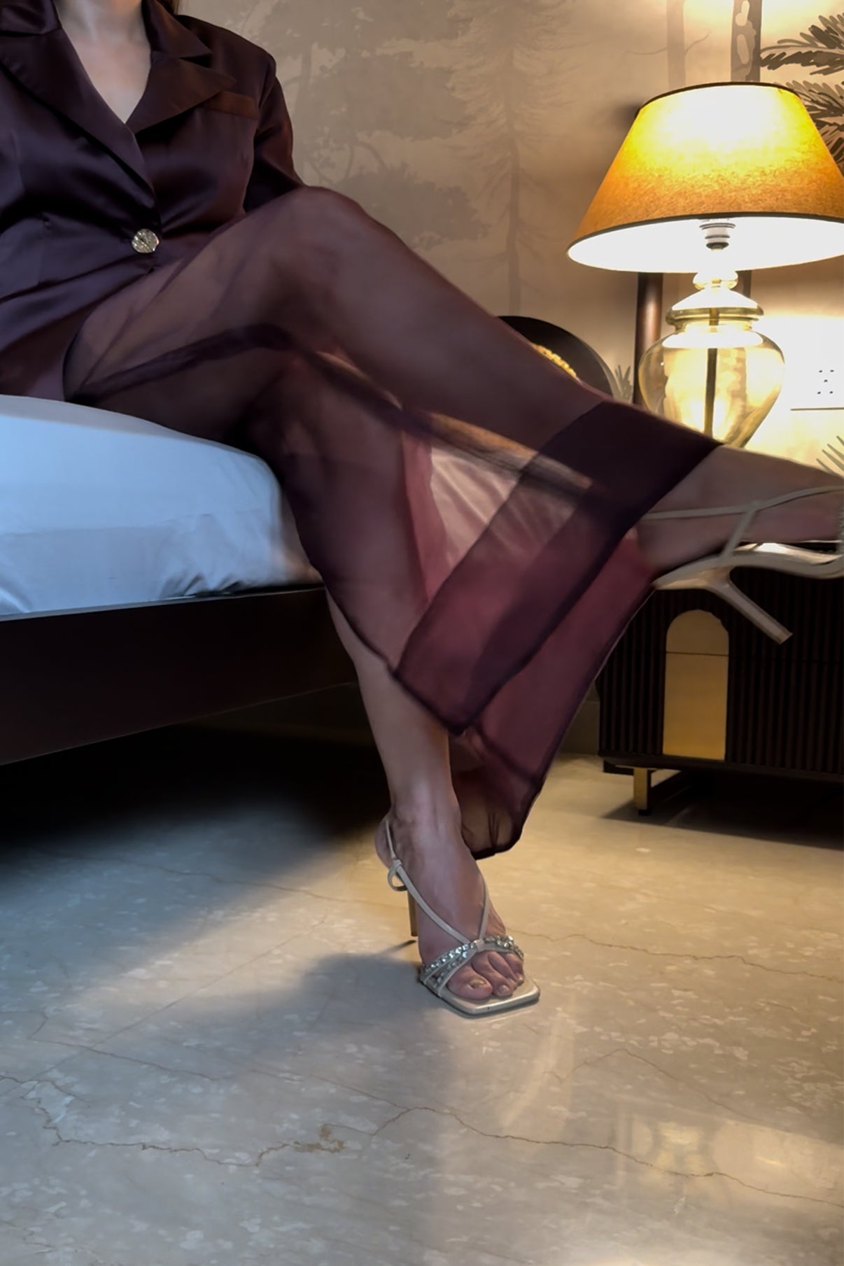 A Wine Clara coord set with structured cuffs offers a chic, tailored look with a modern twist. The ensemble features a sleek, well-fitted top and matching skirt or pants, both crafted in a rich brown hue.